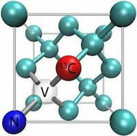В совместной лаборатории ФИАН и Российского квантового центра (RQC) проводится изучение центров окраски алмаза, так называемых NV-центров, представляющих собой элементарную ячейку алмаза, в которой один атом углерода замещен атомом азота (N), а соседний атом отсутствует, тем самым образуя вакансию (V), как показано на рисунке. Получившаяся система называется NV центром или центром окраски. У этого центра окраски имеется ось. Проекция спина электрона на эту ось сохраняется и может служить кубитом. Этот спин является суммарным спином всех электронов, задействованных в этой вставке. Соответственно, этот спин может быть использован в качестве элемента квантовой памяти.
