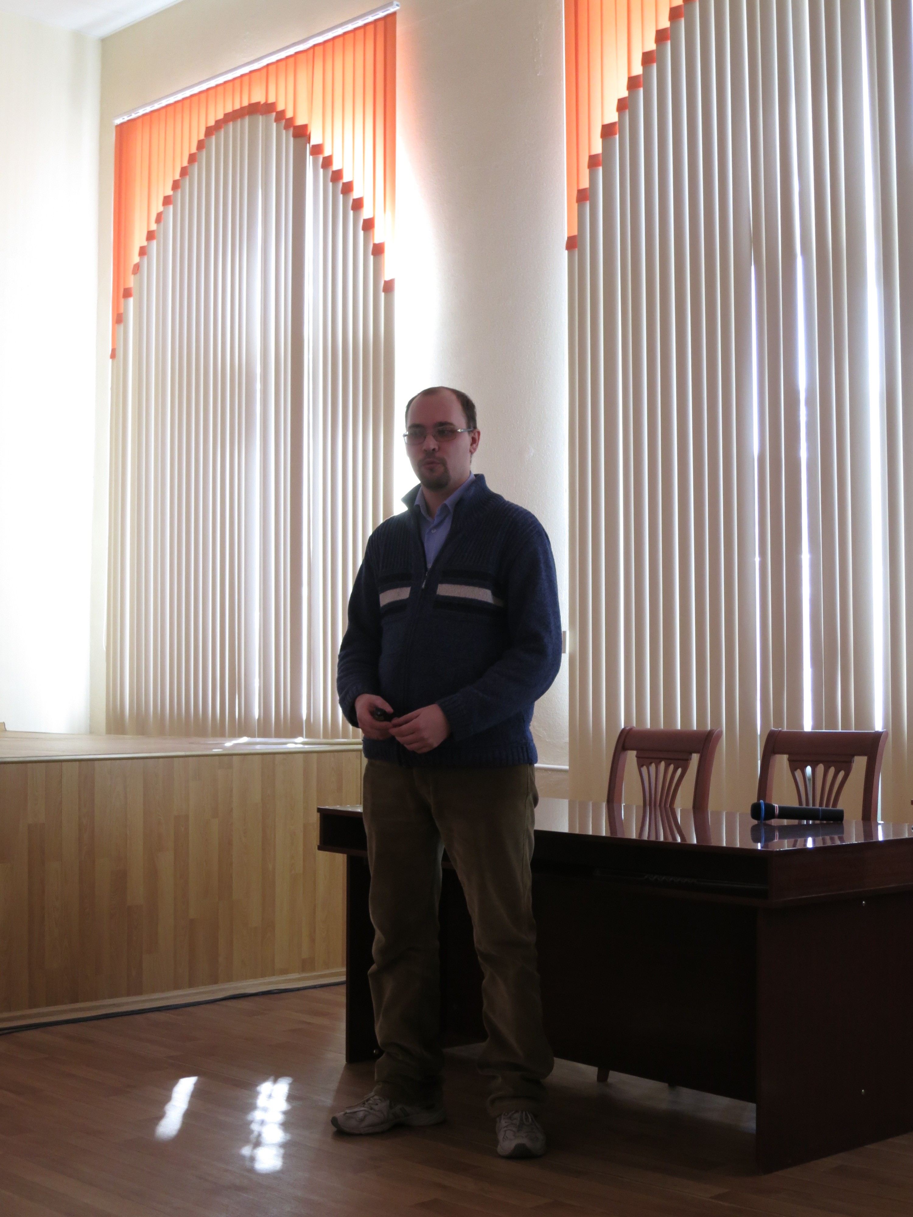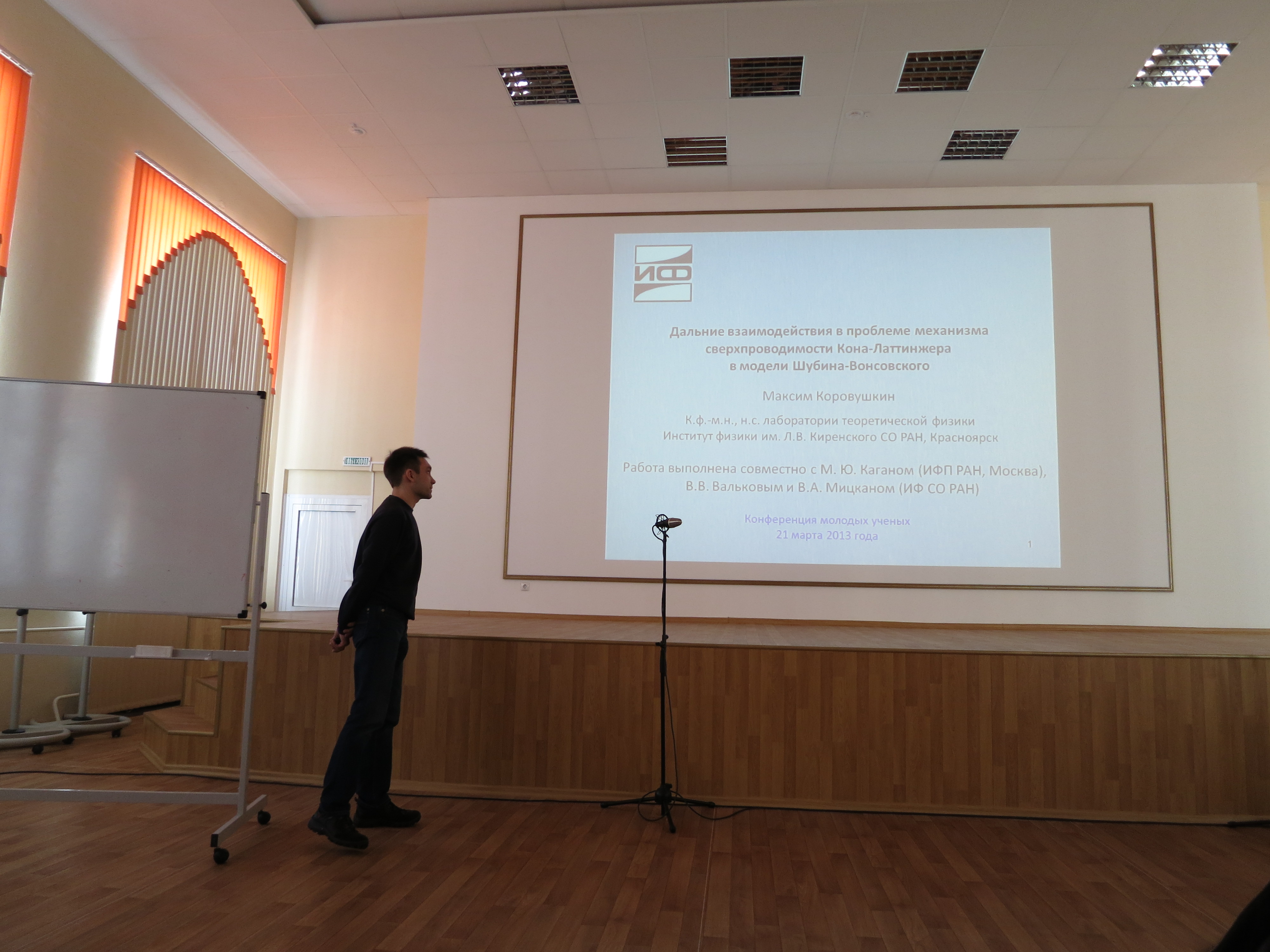Сергей Аксенов, старший научный сотрудник лаборатории теоретической физики Института физики им. Л.В. Киренского Сибирского отделения Российской академии наук (ИФ СО РАН), на конкурсе-конференции молодых ученых Красноярского научного центра Сибирского отделения РАН в 2013 году. Красноярск.