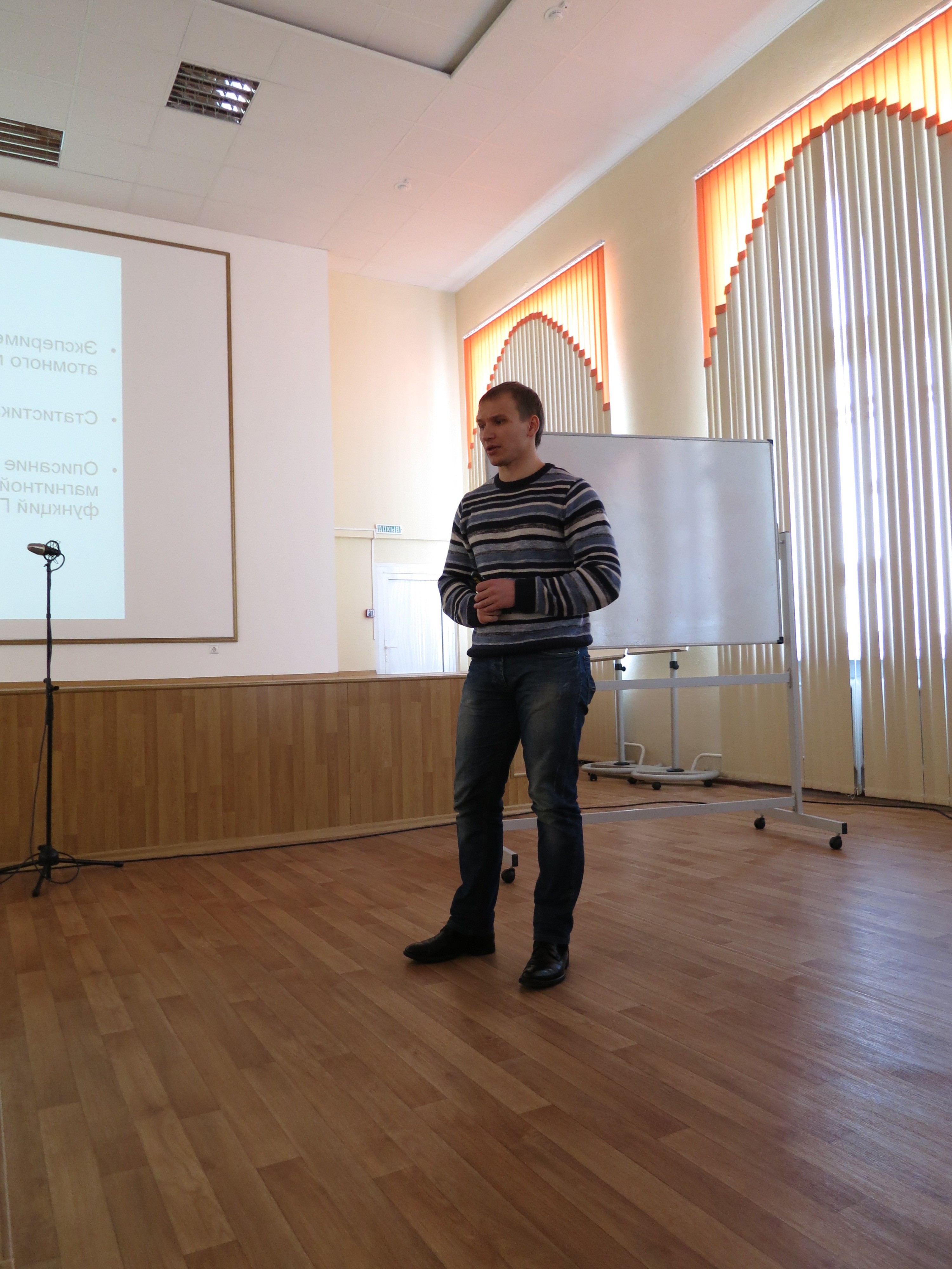 Дмитрий Петров на конкурсе-конференции молодых ученых Красноярского научного центра СО РАН, 2013 год. Доклад "Исследование морфологии, магнитных свойств и магнитного кругового дихроизма наночастиц Ni, полученных методом ионной имплантации в матрице аморфного SiO2 "