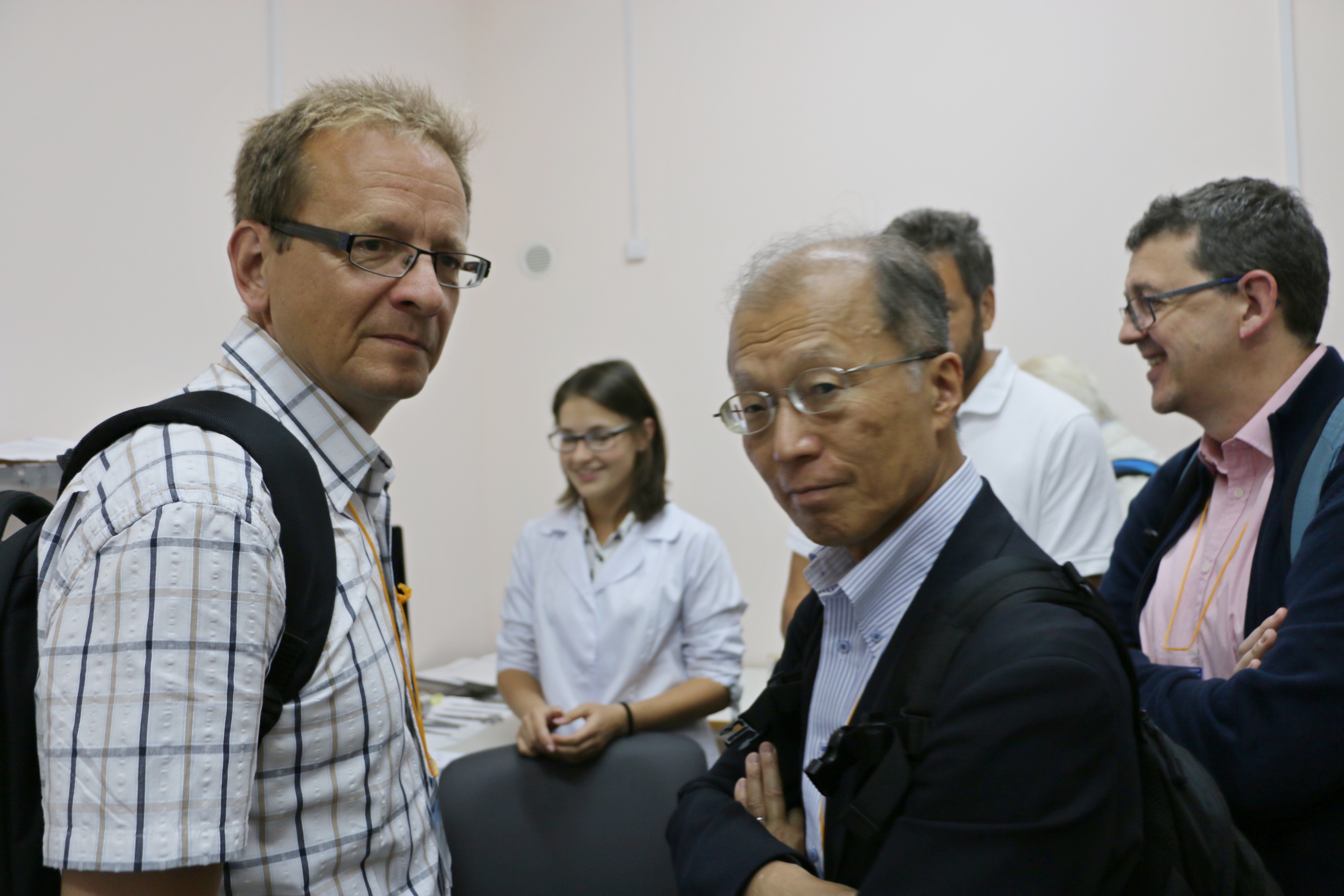 На переднем плане - участники симпозиума EASTMAG-2016, слева направо: Даниель Бюрглер (Юлихский исследовательский центр, Германия), Садамиши Маекава (Научно-исследовательский центр Агентства по атомной энергетике Японии) и Фернандо Бартоломе на экскурсии в лаборатории радиоспектроскопии и спиноновой электпроники Института физики Сибирского отделения Российской академии наук (ИФ СО РАН), Красноярск.