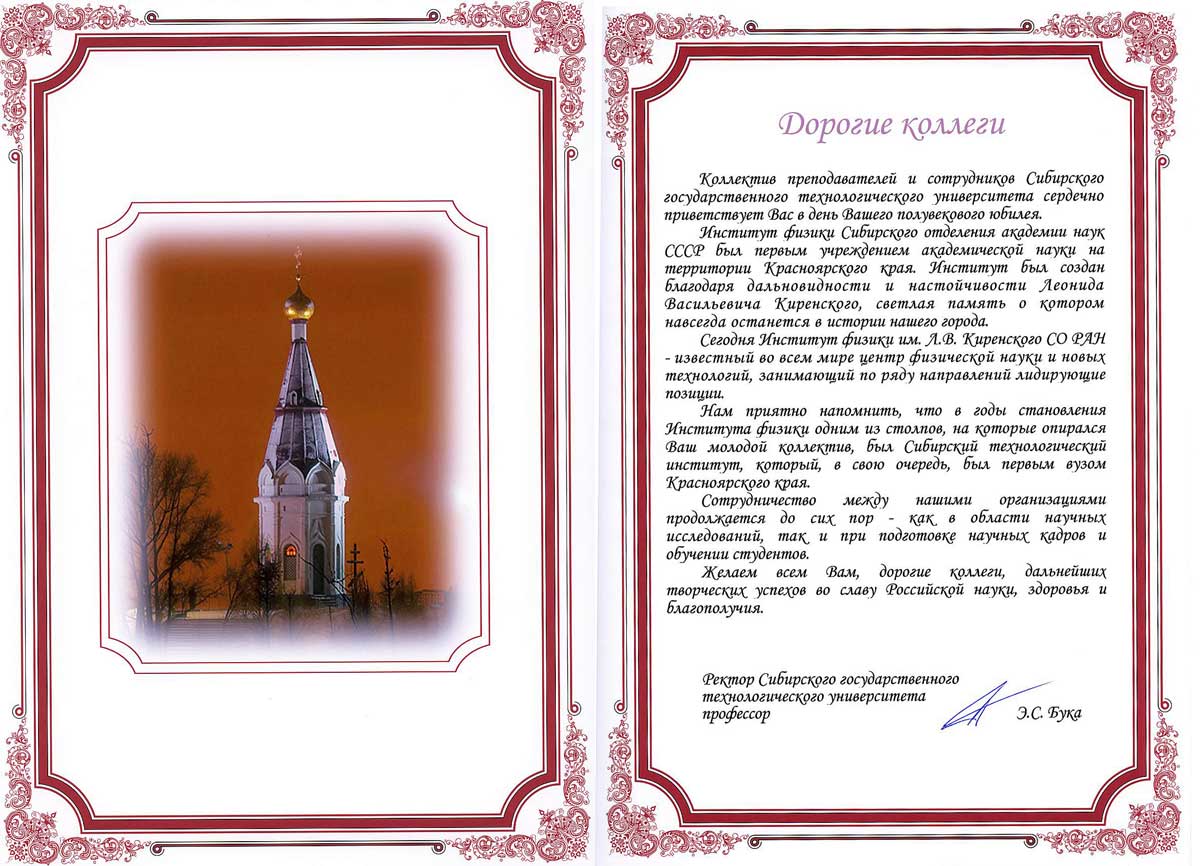 Вы здесь: Главная / Документы / Поздравления с 50-летием Института / Сибирский Государственный технологический университет