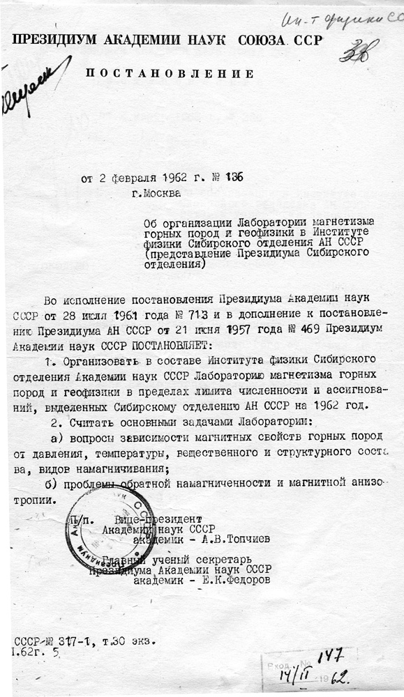 Постановление об организации лаборатории магнетизма горных пород и геофизики