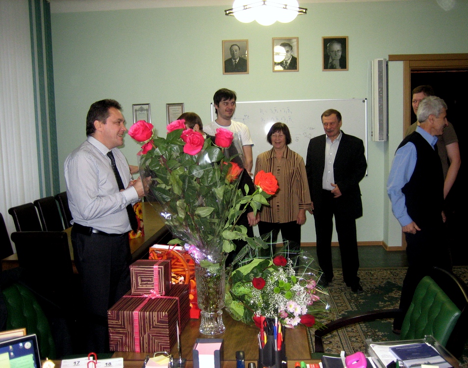 Сотрудники лаборатории радиоспектроскопии и спиновой электроники Института физики им. Л.В. Киренского Сибирского отделения Российской академии наук (ИФ СО РАН ), слева направо: Волков Н. В., Тарасов А. С., Петраковская Э. А., Суховский А. А., Зобов В. Е., 18 ноября 2011 года. Красноярск.