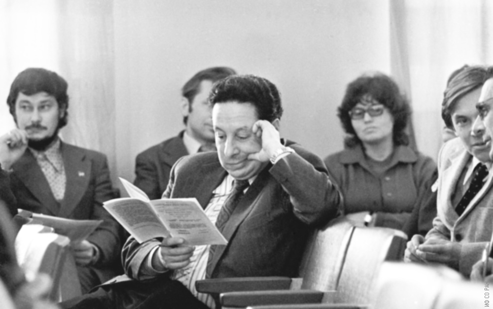 В конференц-зале Института физики им. Л.В. Киренского Сибирского отделения Академии наук СССР (ИФ СО АН СССР) на общеинститутском семинаре по философии, который был организован приказом по институту за № 179 от 13 ноября 1959 года. На переднем плане заместитель директора института, профессор Лундин А.Г. Вдоль стены сидят (слева направо): Столовицкий И. М., Петраковский Г.А., Эдельман И.С., Попов А.К и Игнатченко В.А., фото 1975 года. Красноярск.