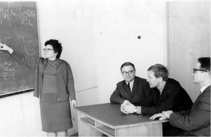 Лаборатория алгебры и математической логики была организована в 1965 году. Слева направо: Бусаркина Л.Р., Бкусаркин В.М., Горчаков Ю.М., Стихин В.П., на одном из первых семинаров лаборатории, фото 1965 года.