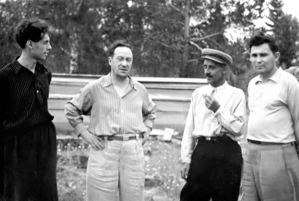На биостанции Института физики Сибирского отделения Академии наук СССР (ИФ СО АН СССР). Слева направо: Гительзон И.И., Киренский Л.В., Николайчук Л.П., Терсков И.А., Снимок 1968 года.