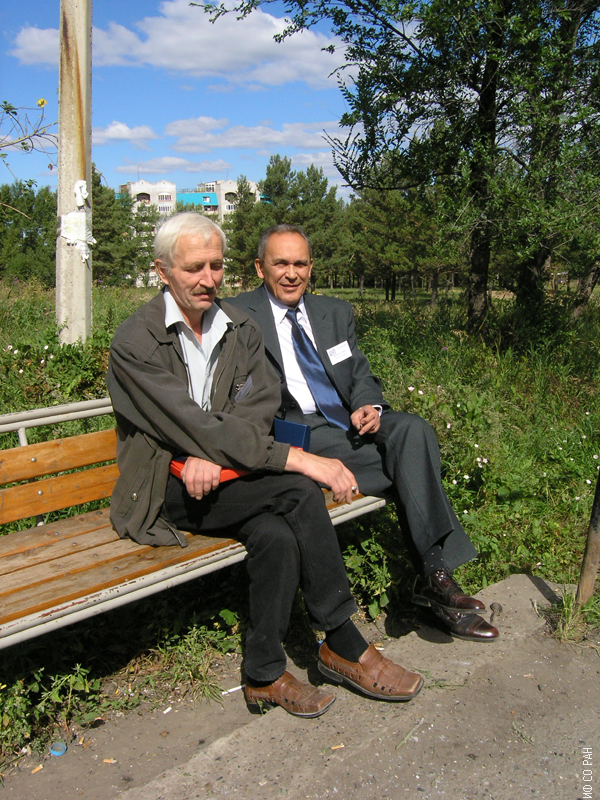 Балаев А. Д. (слева), Петров М. И., сотрудники лаборатории сильных магнитных полей Института физики им. Л.В. Киренского Сибирского отделения Российской академии наук (ИФ СО РАН), во время перерыва на Евро-Азиатском симпозиуме «Прогресс в магнетизме» (ЕASTMAG-2004), организованного и проводимого в Красноярске в августе 2004 года. Симпозиум проводился в стенах Красноярского государственного университета.