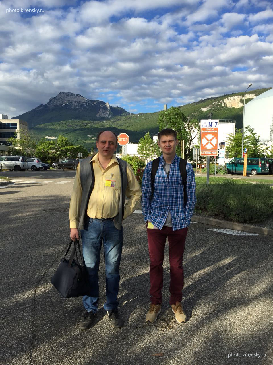Князев Юрий Владимирович (справа), старший научный сотрудник лаборатории резонансных свойств магнитоупорядоченных веществ Института физики им. Л.В. Киренского Сибирского отделения Российской академии наук во Франции для участия в эксперименте на Европейской установке синхронного излучения (ESRF). (Европейский Источник Синхротронного Излучения (ESRF), расположенный в Гренобле — международный проект, в котором участвует 18 стран). Слева Балаев Дмитрий Александрович, директор и заведующий лабораторией резонансных свойств магнитоупорядоченных веществ Института физики. Гренобль, 2018 год