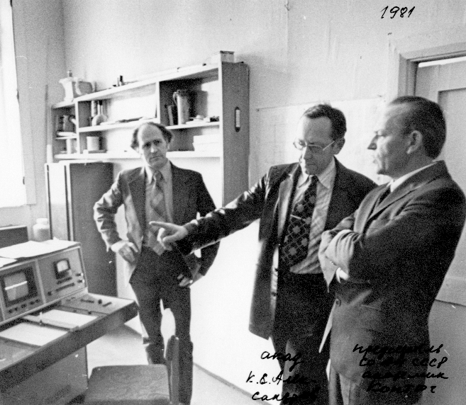 Фото 1981 года. Визит в Институт физики им. Л.В. Киренского Сибирского отделения АН СССР председателя Президиума Сибирского отделения Академии наук СССР (ИФ СО АН СССР) Коптюга В.А. Слева направо: Зеер Э.П., заведующий лабораторией радиоспектроскопического структурного анализа, Александров К.С., директор института, Коптюг В.А. Александров рассказывает о спектрометре 213М. Спектрометр разработан в лаборатории радиоспектроскопического структурного анализа и изготовлен в экспериментальных механических мастерских института. На нем получены уникальные спектры высокого разрешения в сильном магнитном поле сверхпроводящего соленоида. Красноярск.