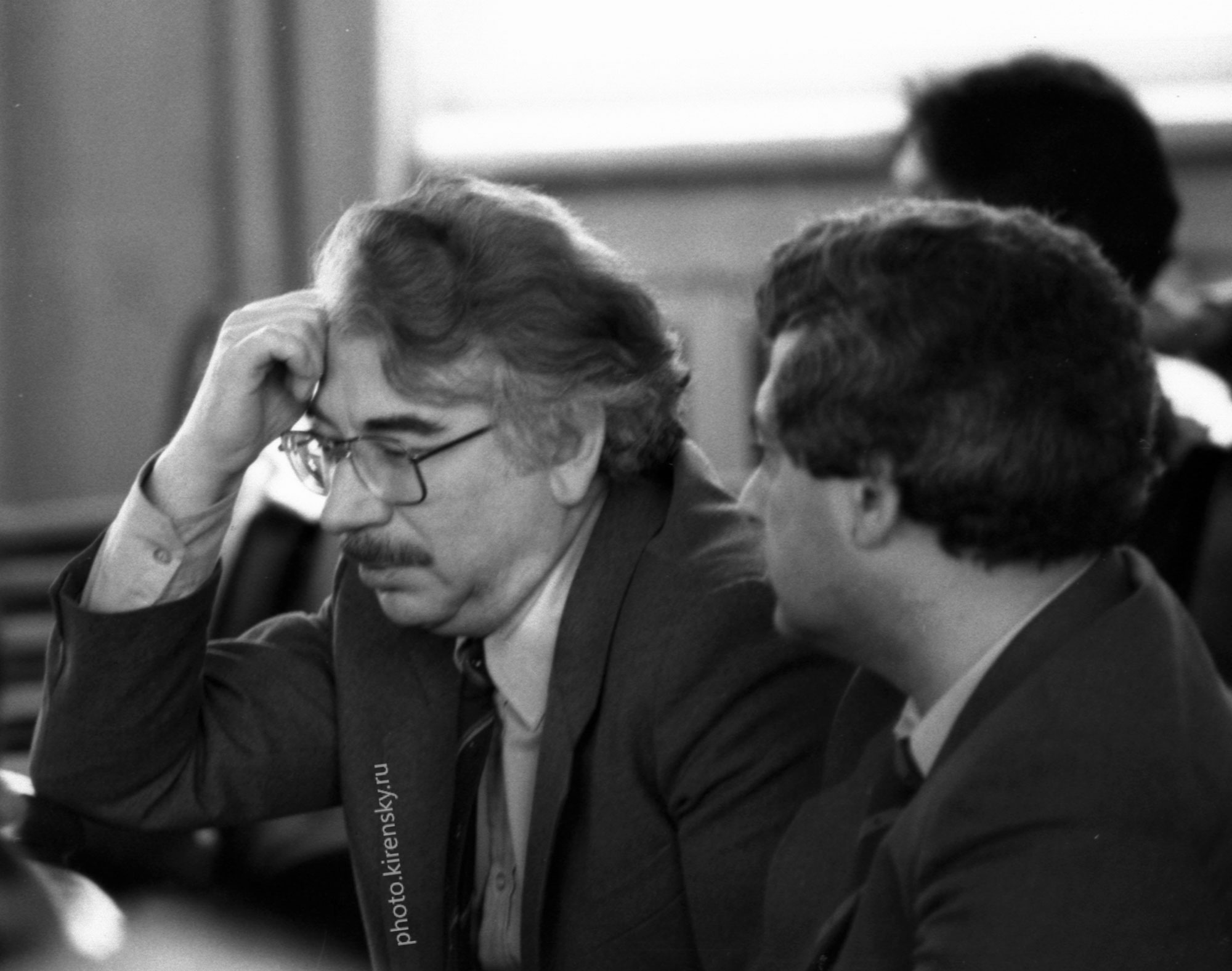 1993 год. На общеинститутском физическом семинаре в Институте физики Сибирского отделения Российской академии наук (ИФ СО РАН). Фролов Г.И., заведующий лабораторией физики магнитных пленок (слева) и Берман Г.П., заведующий лабораторией теории нелинейных процессов. Красноярск.