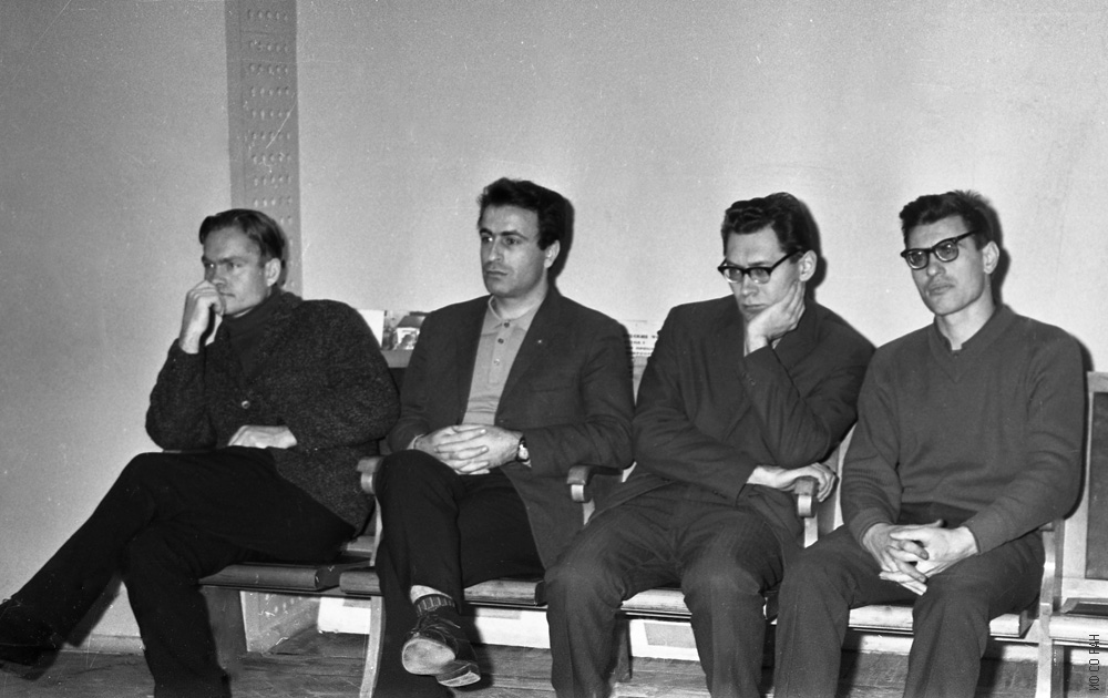 В конференц-зале Института физики Сибирского отделения Академии наук СССР (ИФ СО АН СССР) на специализированном Совете по защите диссертаций. Сотрудники института, слева направо: Кузнецов Н.Ф., Фиш А.М., Якубайлик Э.К., Поцелуйко А.А, фото января 1970 года. Красноярск.