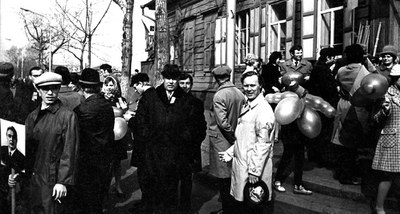 1974 год. Первомайская демонстрация трудящихся Красноярска. Колонна Института физики им. Л.В. Киренского Сибирского отделения Академии наук СССР. На фото (в центре) Баев А.И, заместитель директора института по общим вопросам, Хрусталев Б.П. (в белом плаще), заведующий лабораторией сильных магнитных полей института.
