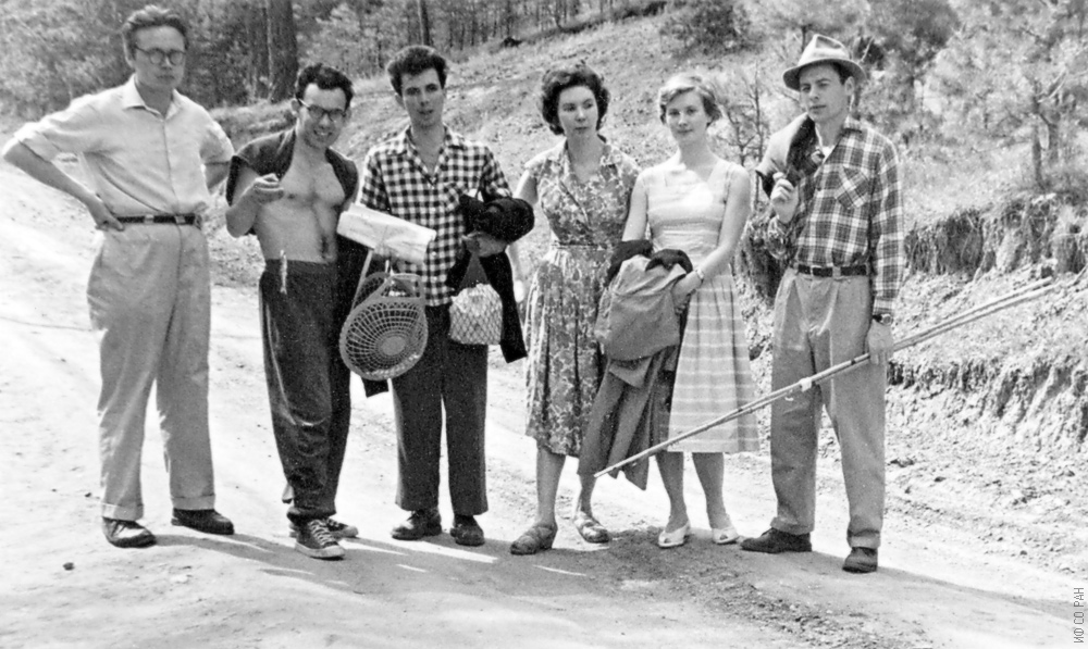 По пути на Красноярские столбы, сотрудники Института физики Сибирского отделения Академии наук СССР (ИФ СО АН СССР), слева направо: Спиров В.В., Саланский Н.М., Руманов Э.Н., Зыкова Н.М, Родичева Э.К., Родичев А.М., Снимок 1960 года.