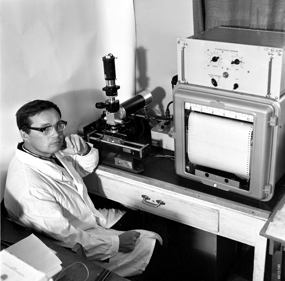 Спиров Владислав Викторович, заведующий фотокинолабораторией Института физики им. Л.В. Киренского Сибирского отделения Академии наук СССР (ИФ СО АН СССР), в лаборатории. Снимок 1978 года. Красноярск.