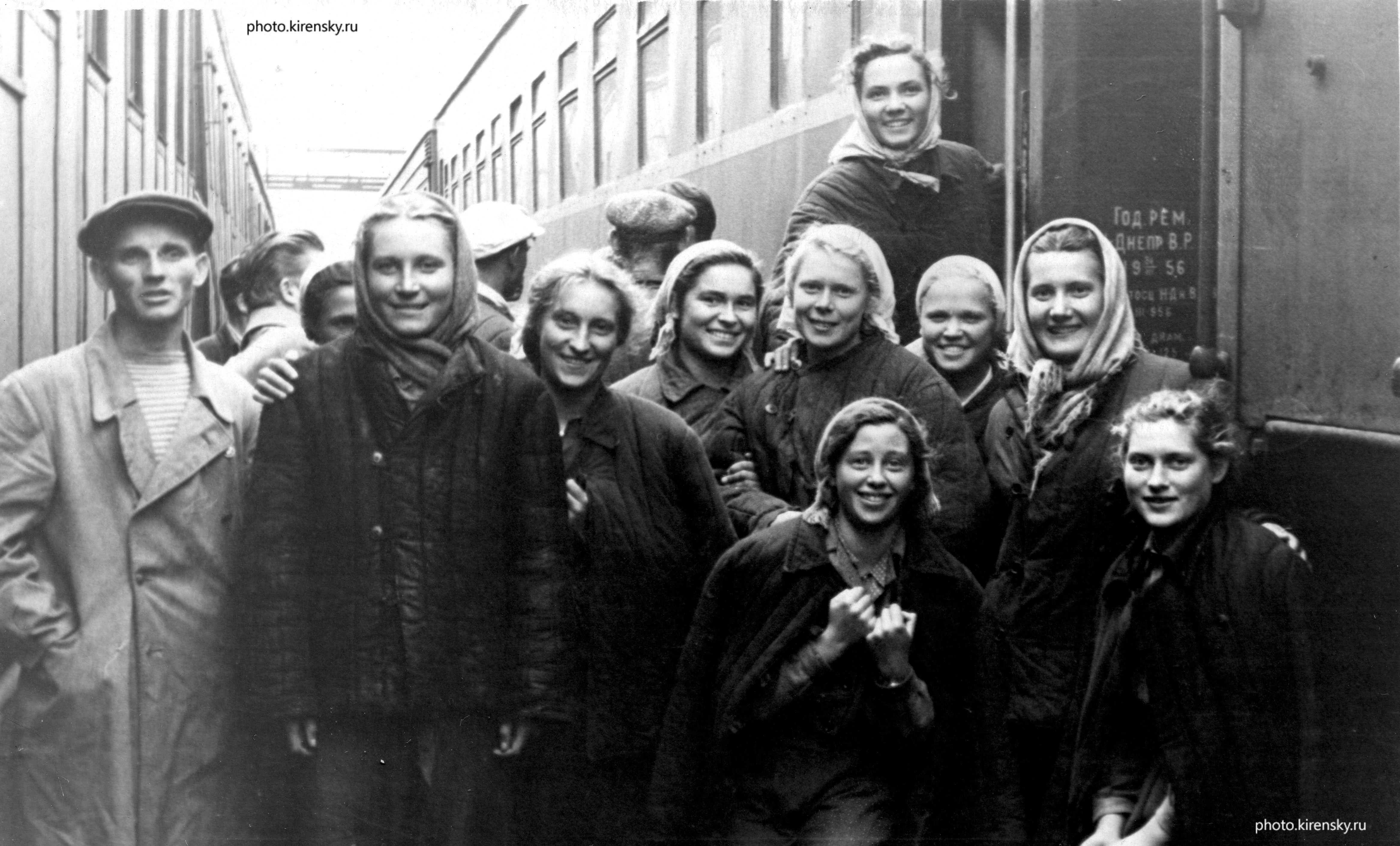 Год 1956. Студенты Томского государственного университета отправляются осенью на сельскохозяйственные работы в один из районов Томской области. Среди них (вторая справа в первом ряду) студентка Новикова Э.А., ныне (2017 год) - Элеонора Анатольевна Петраковская, старший научный сотрудник лаборатории радиоспектроскопии и спиновой электроники Института физики СО РАН в Красноярске.