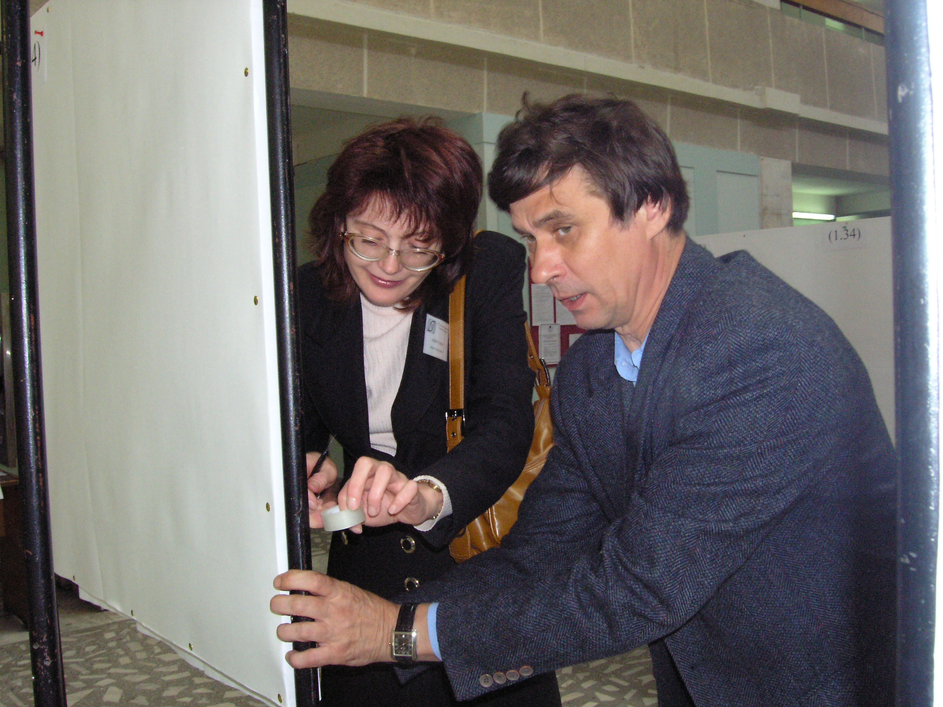 участники Евро-Азиатского симпозиума «Прогресс в магнетизме» (EASTMAG-2004), организованного и проведенного в Красноярске, Л.В. Удод и Ю.Н. Иванов у стендового доклада.