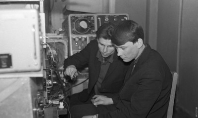 Инженер Уткин Ю.В. и лаборант Соколов А. проводят измерения на установке методом импульсного перемагничивании пленок в лаборатории высокочастотных и импульсных свойств тонких магнитных пленок Института физики Сибирского отделения Академии наук СССР (ИФ СО АН СССР), фото 1967 года. Красноярск.