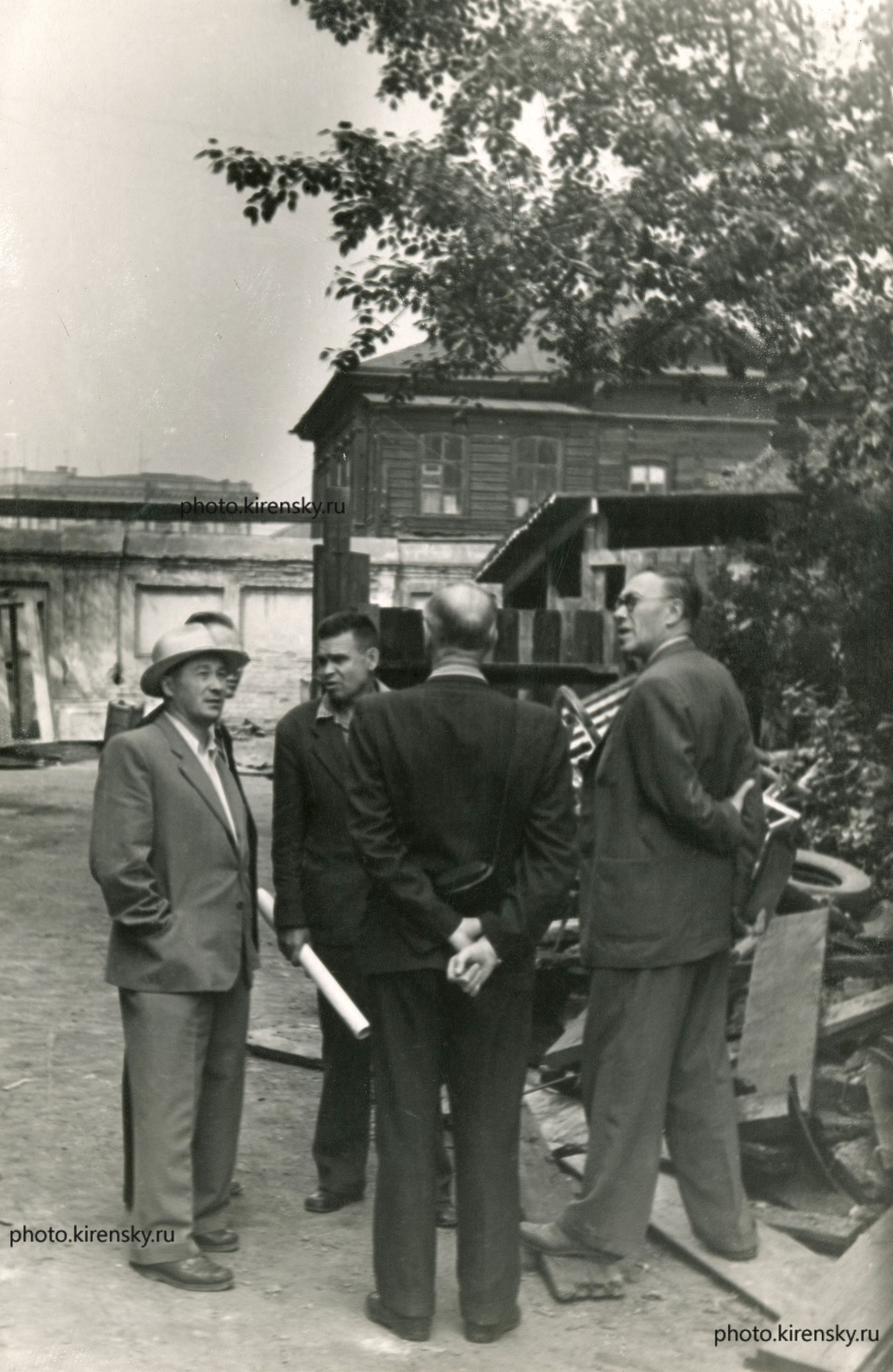 В январе 1957 года Институт физики Сибирского отделения Академии наук СССР (ИФ СО АН СССР) по решению Крайисполкома получил здание по ул. К. Маркса 42, в котором раньше помещался Центральный районный комитет КПСС и райсовет. На фото Л.В. Киренский, директор института (слева) и председатель Сибирского отделения Академии наук СССР М.А. Лаврентьев (справа) во дворе здания Института физики. Снимок 1957 года. Красноярск.