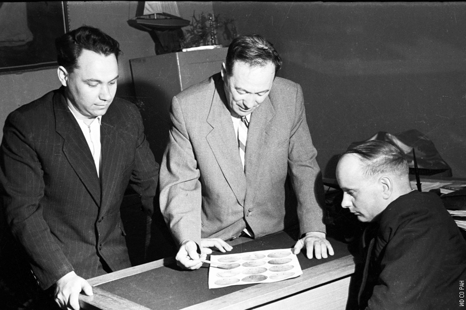 1962 год. Слева направо: В.А. Буравихин (один из первых аспирантов Киренского), Л.В. Киренский (организатор и первый директор Института физики Сибирского отделения Академии наук СССР (ИФ СО АН СССР), М. К. Савченко (один из первых сотрудников института), обсуждают результаты эксперимента по тонким магнитным пленкам. Красноярск.