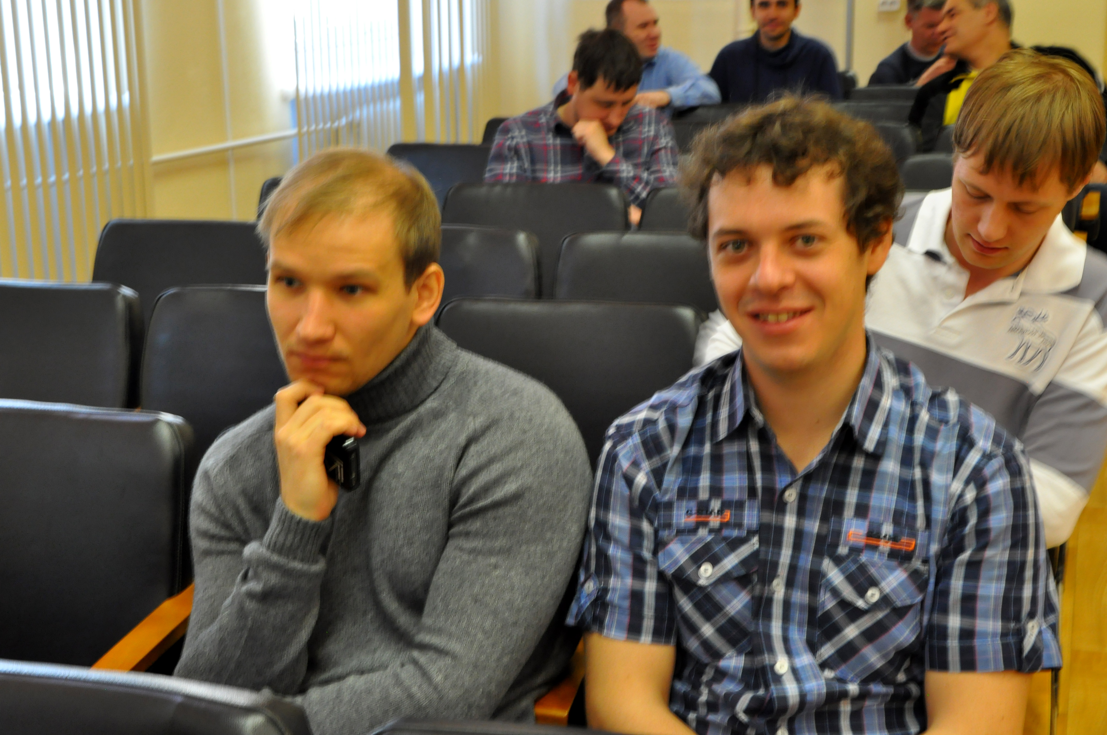 8 мая 2015 года. Старший научный сотрудник Аксенов С.В. (слева) и аспирант Максим Шустин, сотрудники лаборатории теоретической физики Института физики им. Л.В. Киренского Сибирского отделения Российской академии наук, в конференц-зале института перед началом концерта, посвященного 70-тию Победы в Великой Отечественной войне (1941-1945 гг.). Красноярск.