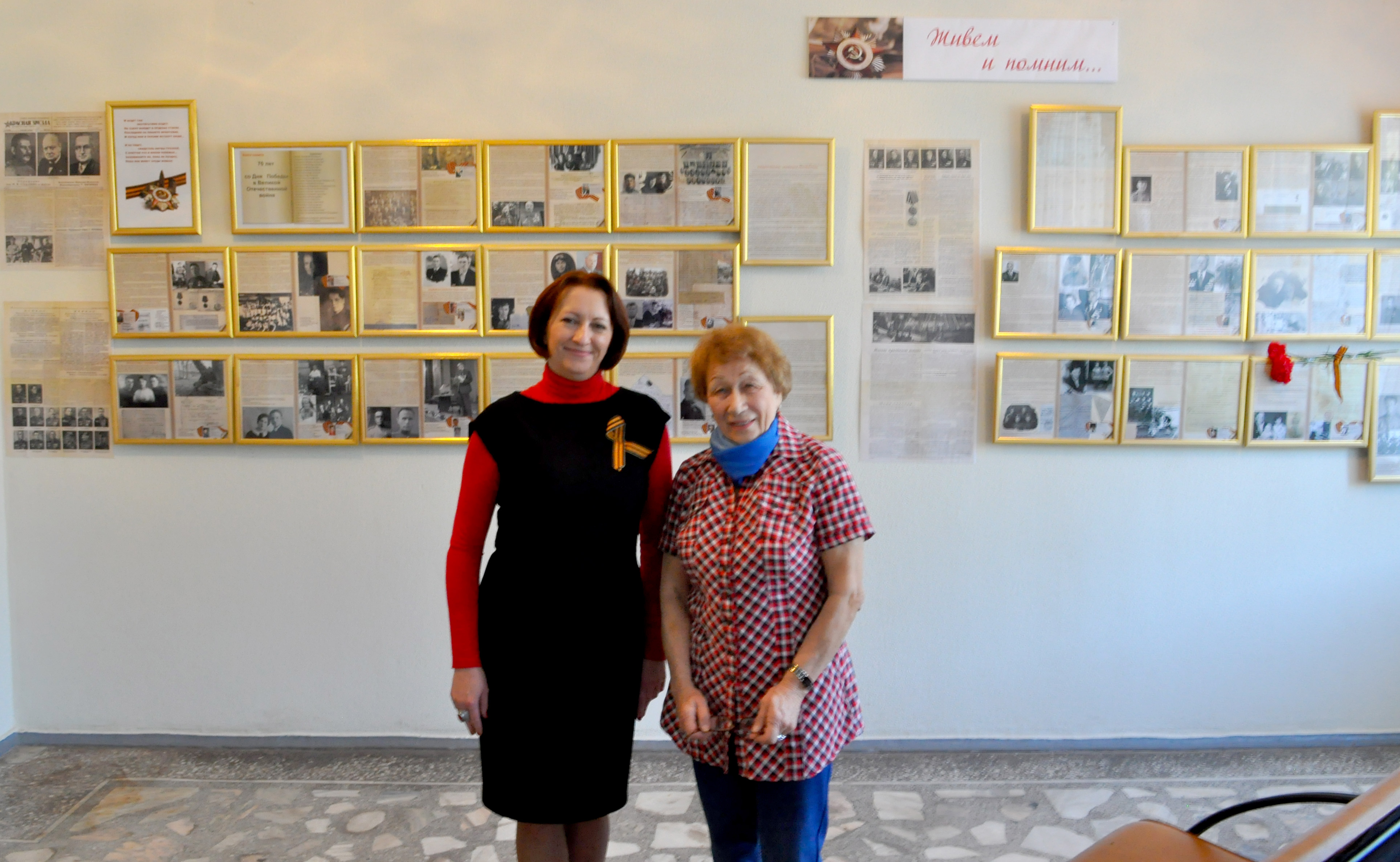 2005 год, 30 апреля. У стенда «Живем и помним…», посвященного 70-тию Победы в Великой Отечественной войне (1941-1945 гг.), сотрудники Института физики им. Л.В. Киренского Сибирского отделения Российской академии наук Бондарева Е.В.(слева) и Хрусталева Л.М. Материалы об их родственниках, участников той войны, размещены на стенде. Красноярск.