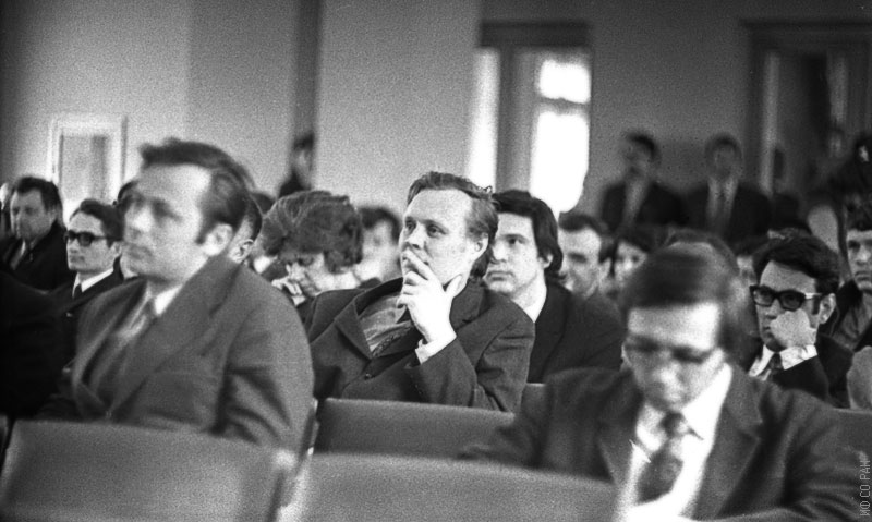 В конференц-зале Института физики Сибирского отделения Академии наук СССР на общеинститутском философском семинаре. В первом ряду - Лисовский Г.М., во втором ряду, крайний слева Лундин А.Г., В третьем ряду, слева направо: Даутов Ш.А., Айзенберг Л.А., Смолин Р.П., фото 1969 года. Красноярск.