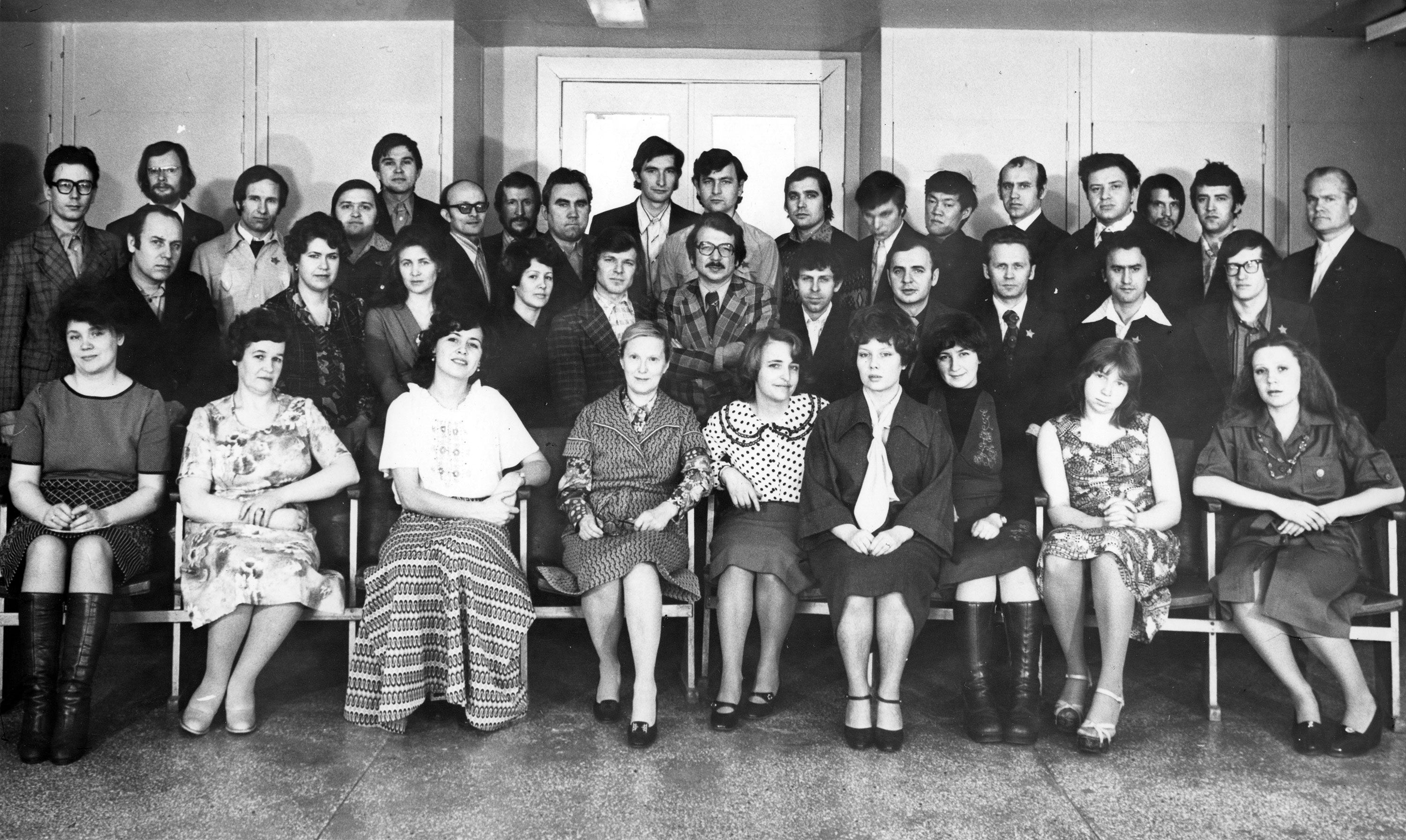 Лаборатория физики магнитных плёнок. 1980 год. Сидят, слева направо: Иванова Р.И., Гоголева Л.М., Дрокина Т.В., Хлебопрос Е.А., Елманова В.А., Буркова Л.В., ?, ?, ?. Во втором ряду: Польский А.И., Иконникова Г.Я., Верхотурова Н.И., Лазарева Л.В., Беляев Б.А., Фролов Г.И., заведующий лабораторией, Резуненко В.И., Ерухимов М.Ш., Гринин Эдуард Федорович, Позняков А., Бабицкий А.Н. В третьем ряду: Худяков А.Е., Вершинин В.В., Яковчук В.Ю., Рузанов В., Тюрнев В.В., Щербаков В.М., Жигалов В.С., Кононов В.П., Трусов Ю.Н., Поляков В.В., Владимиров А.Г., ?, Чжан А.В., Чернов В.К., Глозман Е.А.?, ?, Кузнецов Н.Ф.