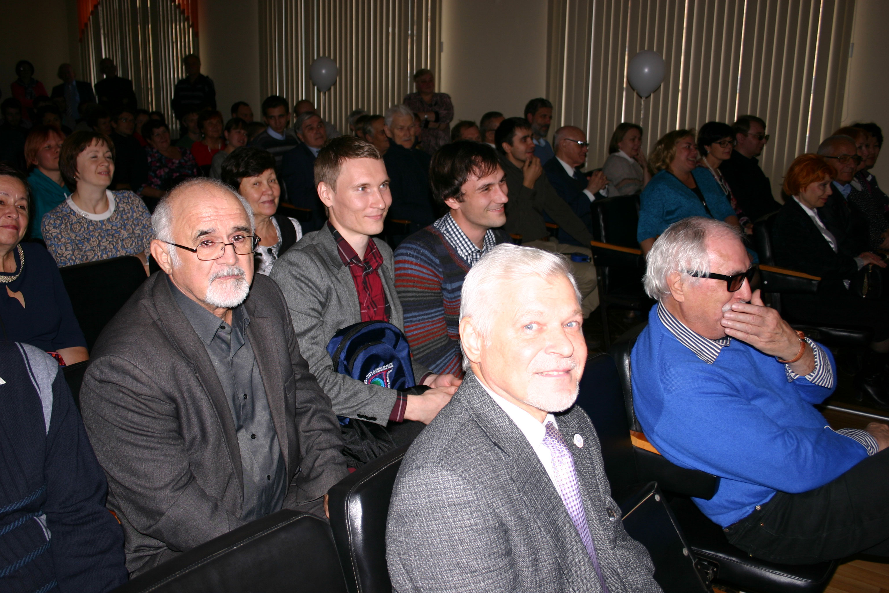 12 октября 2016 года. Конференц-зал Института физики им. Л.В. Киренского Сибирского отделения Российской академии наук. Расширенное заседание ученого Совета, посвященное 60-летию образования института, с участием сотрудников института, представителей администраций города и края, директоров предприятий-партнеров, директоров подразделений ФИЦ КНЦ СО РАН (Федеральный исследовательский центр "Красноярский научный центр Сибирского отделения Российской академии наук") и других гостей. В первом ряду: Беляев Б.А., заведующий лабораторией электродинамики и СВЧ электроники (слева) и Исхаков Р.С., заведующий лабораторией физики магнитных пленок. Во втором ряду (слева) Архипкин В.Г., заведующий лабораторией когерентной оптики. В третьем ряду: Дрокина Т.В., старший научный сотрудник лаборатории резонансных свойств магнитоупорядоченных веществ (слева) и Матыгулина М.М. , бухгалтер института. Красноярск.