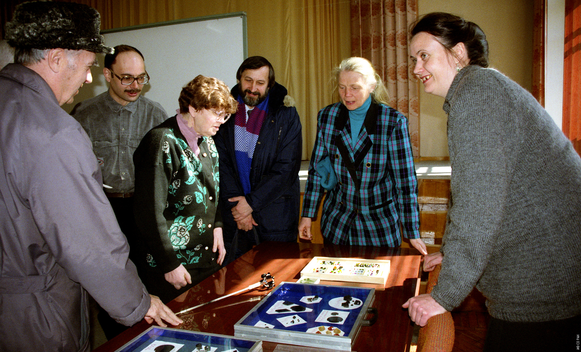 8 апреля 1999 года состоялись традиционные научные чтения памяти академика Л.В. Киренского, организатора и первого директора Института физики им. Л.В. Киренского Сибирского отделения Российской академии наук (ИФ СО РАН). В перерыве участники чтений рассматривают выставку кристаллов, выращенных в лаборатории магнитных материалов Института физики (заведующий лабораторией Безматерных Л.Н.). Слева направо: Лисовский Г.М., заведующий лабораторией управляемого биосинтеза Института биофизики СО РАН; Гладышев М.И., заместитель директора по научной работе Института биофизики СО РАН; профессор Эдельман И.С., Институт физики СО РАН; Болсуновский А.Я., заведующий лабораторией радиоэкологии Института биофизики СО РАН; Исаева Т.Н., Институт физики СО РАН; Гудим И.А., Институт физики СО РАН. Красноярск.