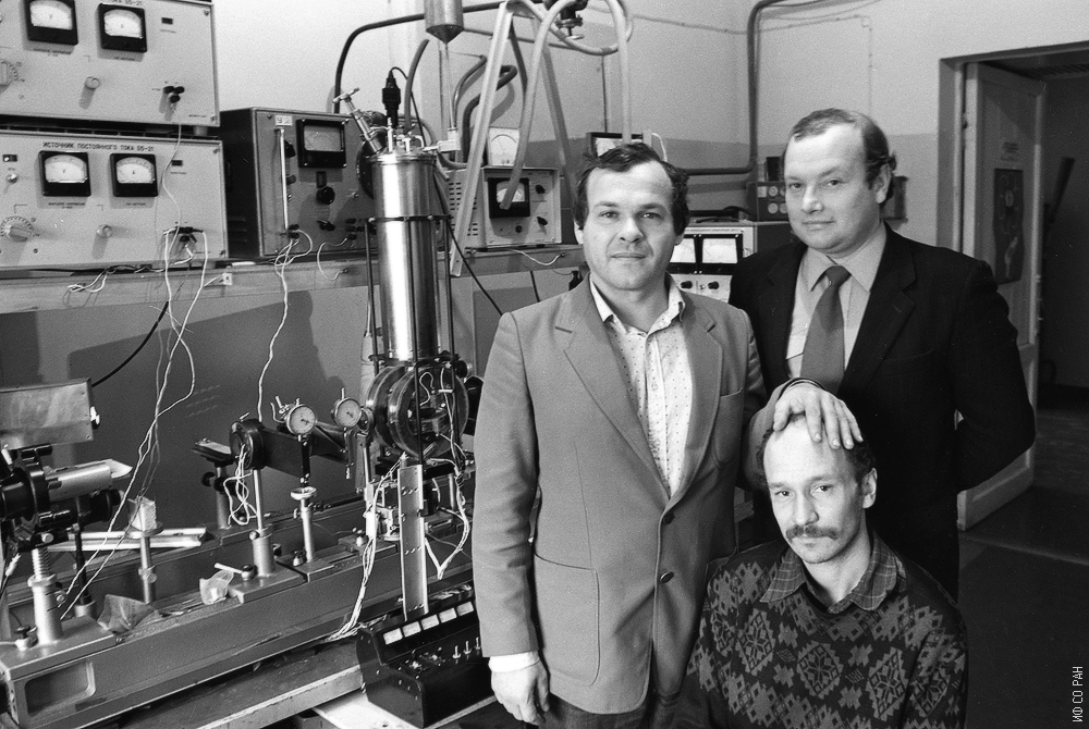 1978 год. Лексиков А. А. (слева), Фёдоров Ю. М., сидит Аксенов А.Е, сотрудники лаборатории физики магнитных пленок Института физики им. Л.В. Киренского Сибирского отделения Академии наук СССР (ИФ СО АН СССР). Красноярск.