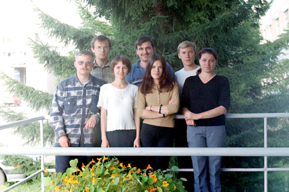 Август 2003 год. Сотрудники лаборатории аналитических методов исследования вещества Института физики им. Л.В. Киренского Сибирского отделения Российской академии наук (ИФ СО РАН). Слева направо: Сыченко Д.П. - аспирант КГУ, Марачевский А.В., Булина Н.В., Глущенко Г.А., Грязнова С.А.- студентка КГУ, Лопатин В.А., Внукова Н.Г. Красноярск.