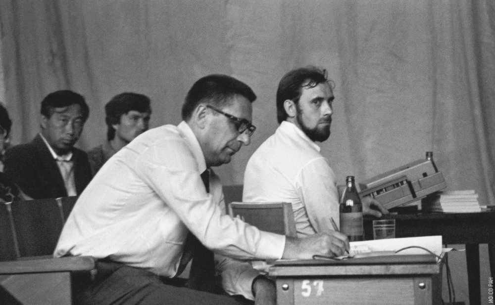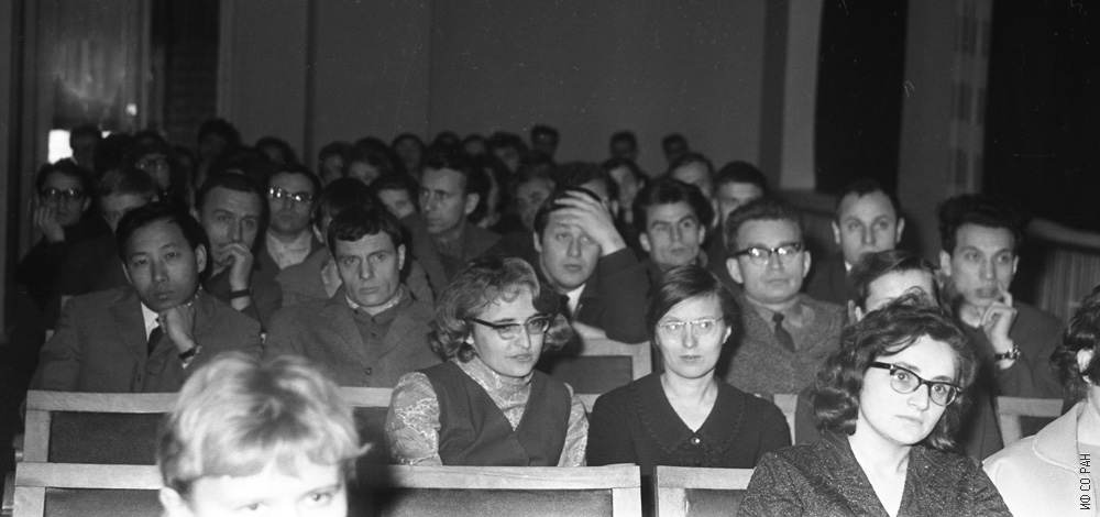 1993 год. Актовый зал Института физики им. Л.В. Киренского Сибирского отделения Российской академии наук (ИФ СО РАН). Заседание диссертационного совета. Вопрос задает Петраковский Г.А. Во втором ряду, крайний слева - Зиненко В.И., ведущий научный сотрудник лаборатории кристаллофизики ИФ. Красноярск.