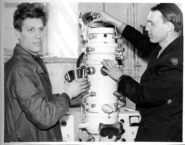 Младший научный сотрудник Комалов А.С. (справа) и ведущий инженер Плотников В.Ф., сотрудники лаборатории магнитных монокристаллических пленок Института физики Сибирского отделения Академии наук СССР (ИФ СО АН СССР), ремонтируют электронный микроскоп ЭМ-7, фото 1967 года. Красноярск.
