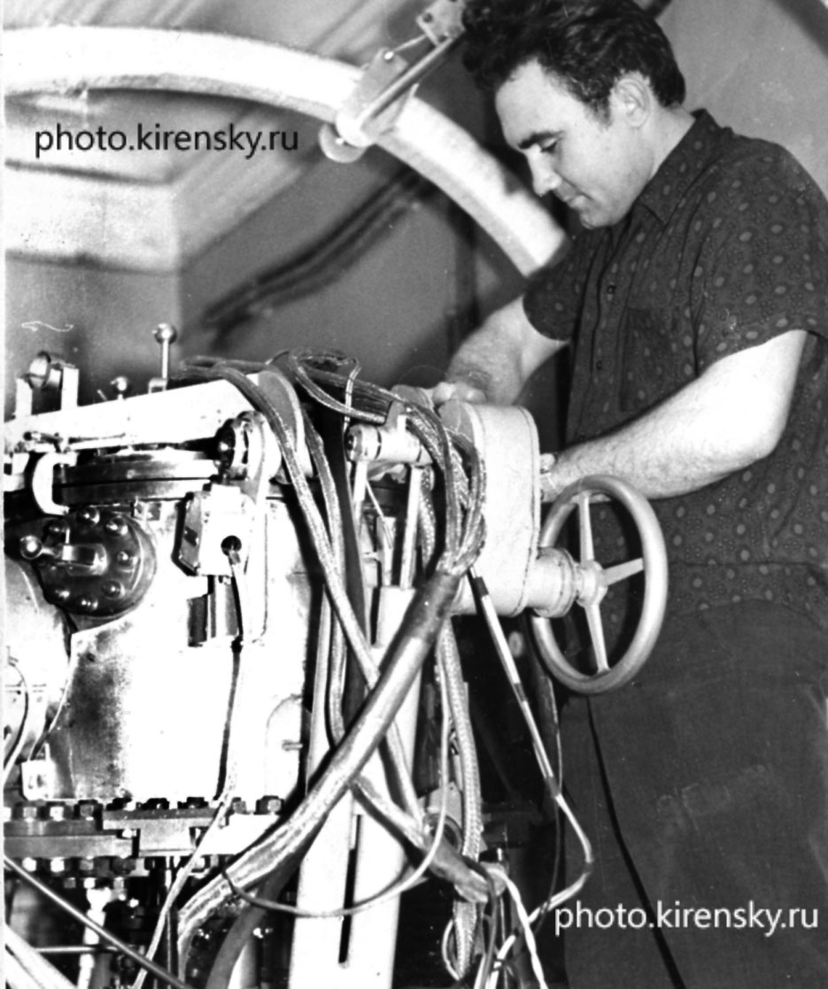 1967 год. В.П. Кононов, ведущий инженер лаборатории высокочастотных и импульсных свойств тонких магнитных пленок Института физики Сибирского отделения Академии наук СССР (ИФ СО АН СССР) (СО АН СССР с 1991 года СО РАН), за вакуумной установкой УНУ-1 для напыления пленок. Красноярск.