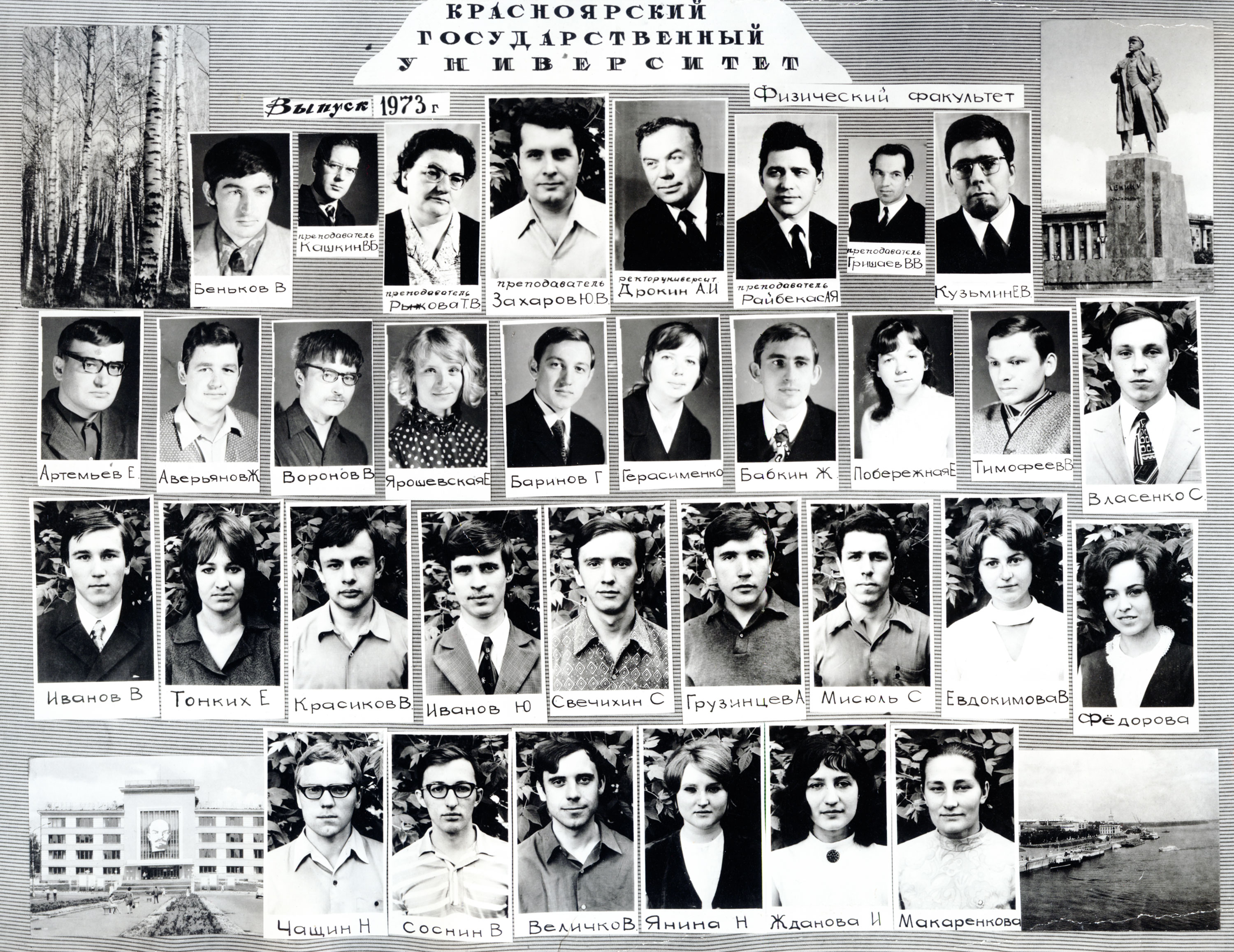 Выпуск физического факультета КГУ. Артемьев Е.М., Захаров Ю.В., Дрокин А.И., Кузьмин Е.В., Аверьянов Е.М. Воронов В.Н., Бабкин Е.В., Иванов Ю.Н., Мисюль С.В., Тимофеев В.П, Красиков В.С., Соснин В.М., Величко В.В. 1973 г.