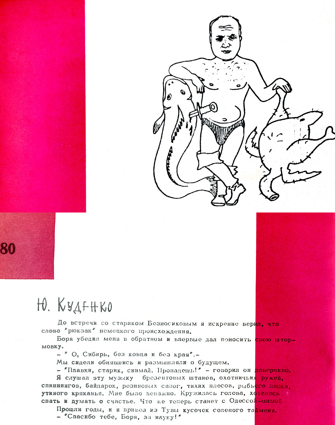 Дружеский шарж Куденко Ю.А. из книги шаржей "Музей друзей", первая часть которой вышла в 1967 году. Авторами ее являются научные сотрудники института О.А. Баюков и Н.С. Чистяков. Книга вышла малым тиражом (всего 100 экземпляров) и моментально разошлась среди персонажей книги, сотрудников и была подарком авторов к юбилею института, 1967 год.