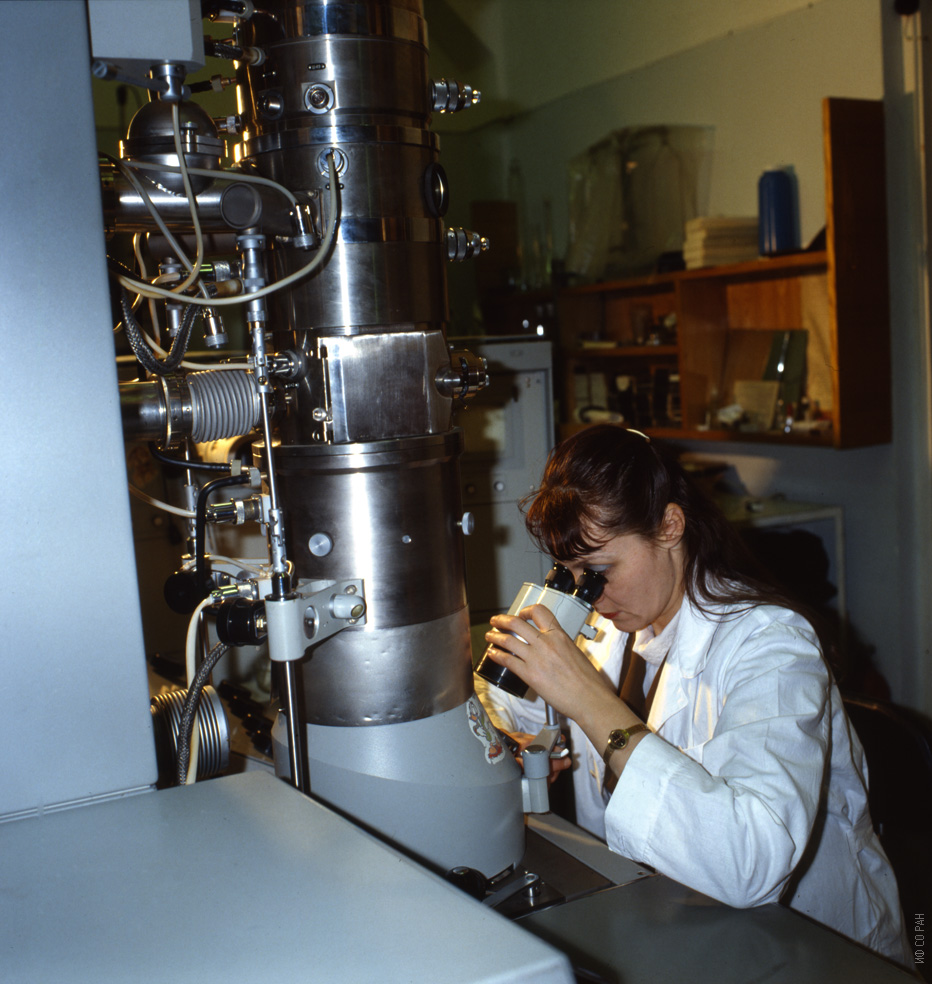 Квеглис Л.И., сотрудник Института физики им. Л.В. Киренского Сибирского отделения Академии наук СССР (ИФ СО АН СССР), за работой на электронном микроскопе. Снимок 1985 года.
