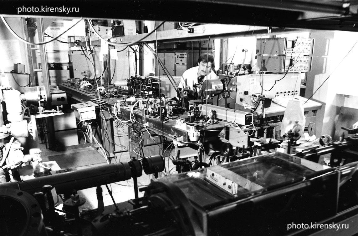В лаборатории когерентной оптики Института физики им. Л.В. Киренского Сибирского отделения АН СССР велись работы по исследованию нелинейных оптических свойств атомов и молекул при воздействии на них сильных резонансных лазерных полей. На снимке: Лукиных В.Ф. (слева) и Подлесоцкий Н.В. осуществляют юстировку перестраиваемого лазера на кристалле, созданного в лаборатории. Фото 1984 года. Красноярск.