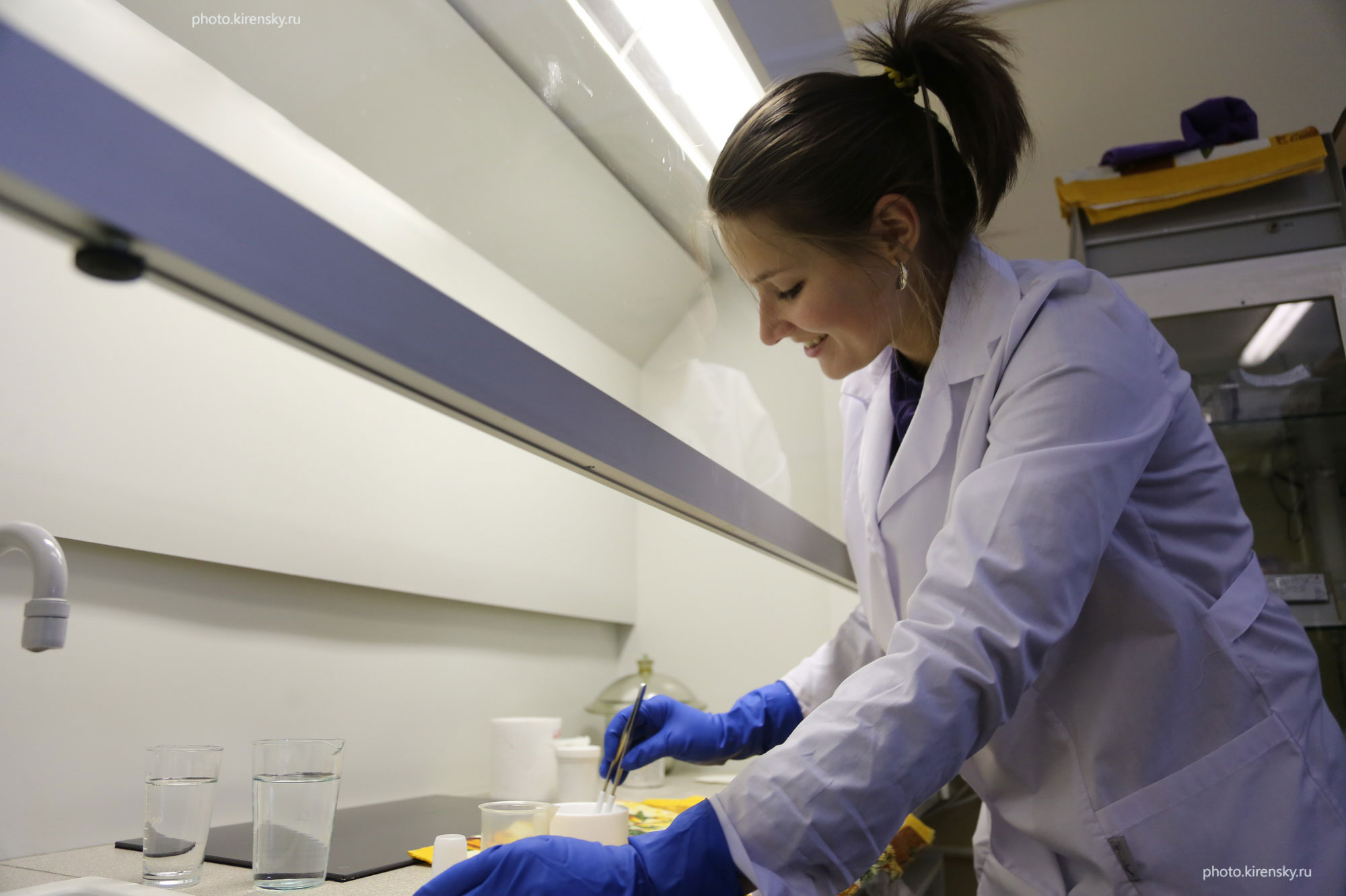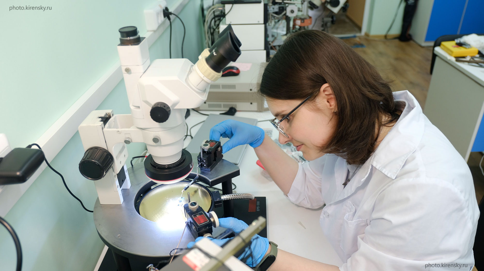 Лукьяненко Анна Витальевна, инженер-физик по образованию, кандидат физико-математических наук, научный сотрудник лаборатории радиоспектроскопии и спиновой электроники Института физики им. Л.В. Киренского Сибирского отделения Российской академии наук. Идет настройка зондов настольной зондовой станции для изучения электрических свойств при повышенных температурах в 2025 году.