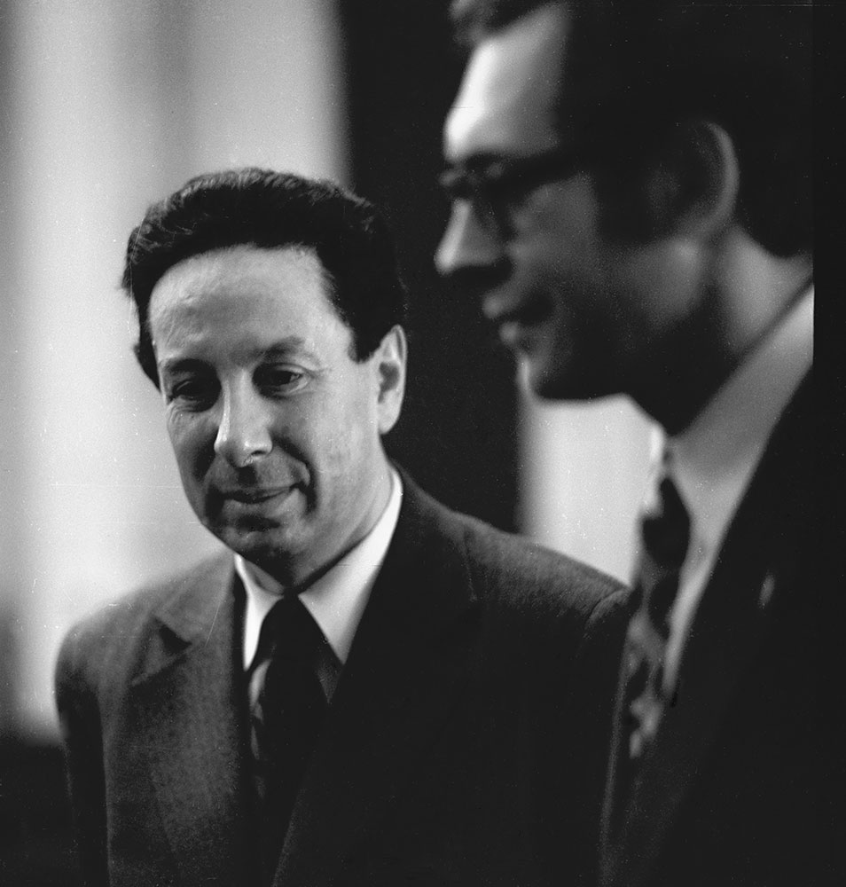 1969 год. Профессор Лундин А.Г. (справа), заместитель директора по научной работе и профессор Дрокин А.И., заместитель директора по научной работе Института физики Сибирского отделения Академии наук СССР (ИФ СО АН СССР) в конференц-зале института. Красноярск.