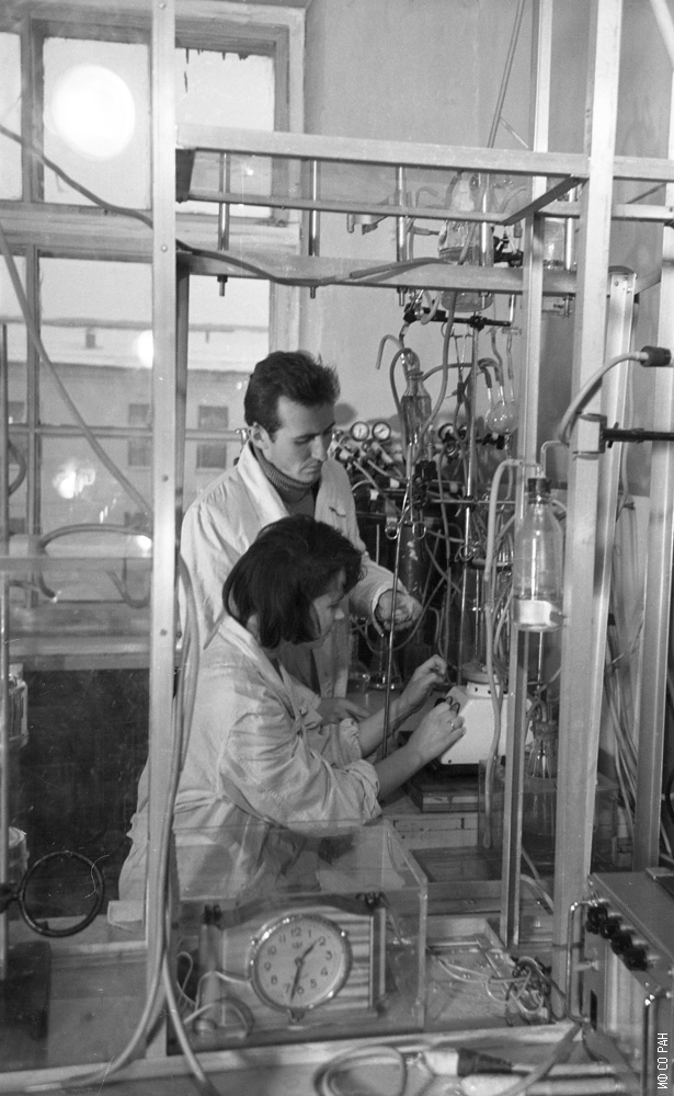 Нефедов В.П. и Сомова Л.А., научные сотрудники отдела биофизики Института физики им. Л.В. Киренского Сибирского отделения Академии наук СССР (ИФ СО АН СССР), за установкой по исследованию физиологического состояния популяции клеток костного мозга, Фото 1970 года. Красноярск.