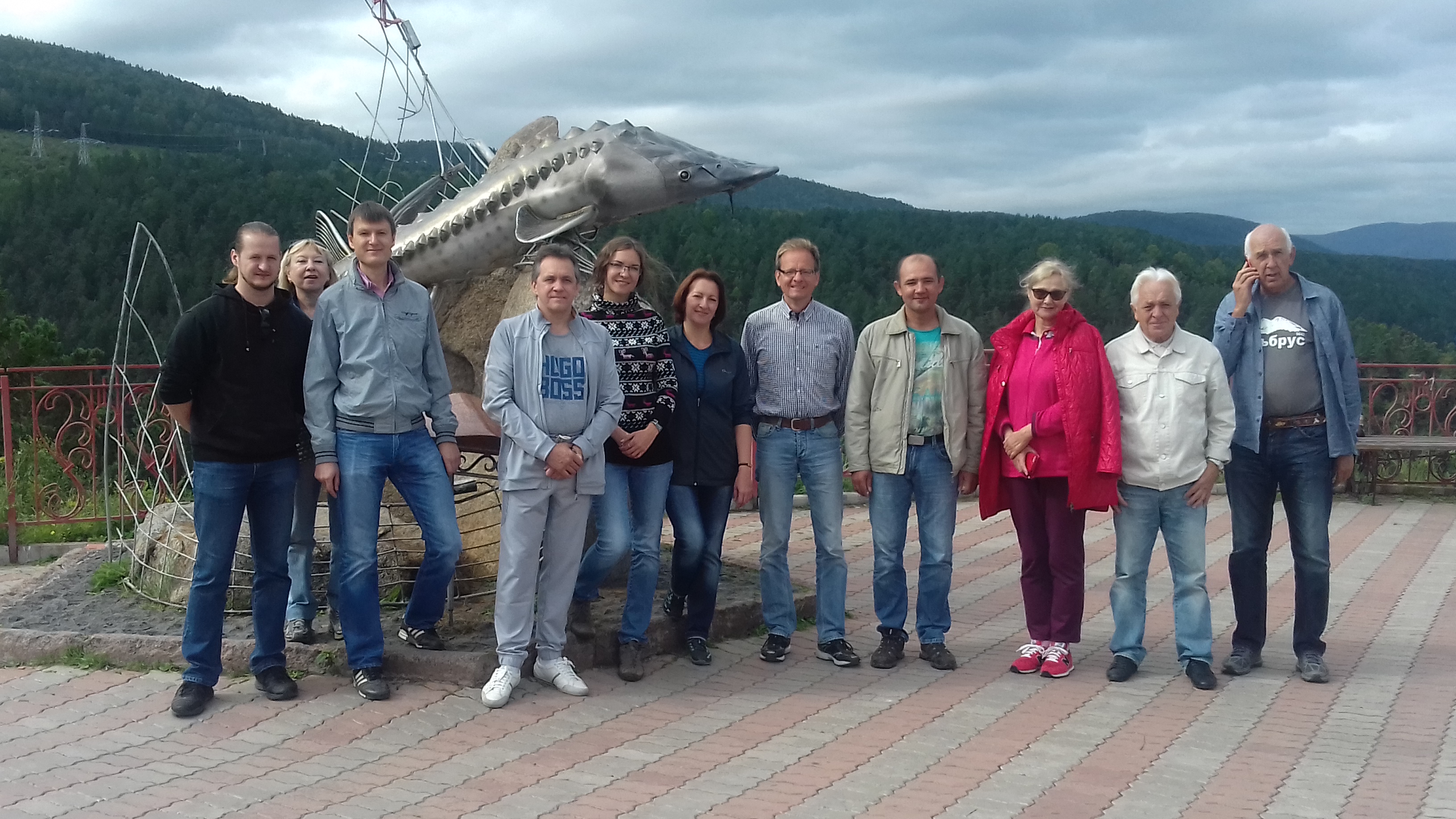 Красноярская ГЭС. Участники международного рабочего совещания по квантовой наноспинтронике (21−23 августа 2016 г.). Х. Майерхайм (Институт физики микроструктур общества Макса Планка, Галле, Германия), А.В. Телегин (Институт физики металлов им. М.Н. Михеева Уральского отделения Российской академии наук), Н.А. Виглин (Институт физики металлов им. М.Н. Михеева УрО РАН), С.О. Демокритов (Мюнстерский университет, Германия), О.Н. Бруштунова (Институт физики им. Л.В. Киренского Сибирского отделения Российской академии наук (ИФ СО РАН)), Р.В. Писарев (Институт Иоффе РАН), Н.В. Гребенникова (Институт физики им. Л.В. Киренского СО РАН), А.Б. Ринкевич (Институт физики металлов им. М.Н. Михеева УрО РАН), Д.А. Смоляков (Институт физики им. Л.В. Киренского СО РАН), Н.В. Волков (Институт физики им. Л.В. Киренского СО РАН), Т.П. Криницына (Институт физики металлов им. М.Н. Михеева УрО РАН), С.Н. Варнаков (Институт физики им. Л.В. Киренского СО РАН), Д. Бюрглер (Юлихский исследовательский центр, Германия), академик РАН В.В. Устинов (Институт физики металлов им. М.Н. Михеева УрО РАН), Т.М. Овчинникова (Институт леса им. В.Н. Сукачёва СО РАН), Е.В. Ерёмин (Институт физики им. Л.В. Киренского СО РАН), Е.В. Бондарева (Институт физики им. Л.В. Киренского Сибирского отделения Российской академии наук) и С.Г. Овчинников (Институт физики им. Л.В. Киренского СО РАН).