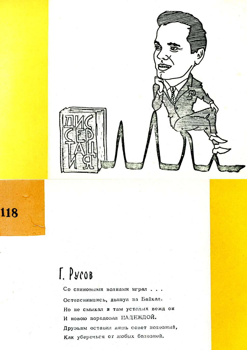 Дружеский шарж Русова Г.И. из книги "Музей друзей", изданной научными сотрудниками Института физики Сибирского отделения Академии наук СССР (ИФ СО АН СССР) Олегом Артемьевичем Баюковым и Николаем Сергеевичем Чистяковым. Удивительная книжка дружеских шаржей и эпиграмм на сотрудников Института физики СО АН СССР. Она вышла в 1967 году к 10-летию начала работы института. Вышла небольшим тиражом в 100 экземпляров и распространялась строго по списку, лично в руки. Узнать себя на страницах книги смогли 48 самых ярких и заметных личностей молодого института. Позже (в 1971 году) вышла вторая книга под таким же названием. Что побудило их взяться за такой труд, авторы подробно изложили в предисловии к первой и второй книгам. Книги размещены на сайте.