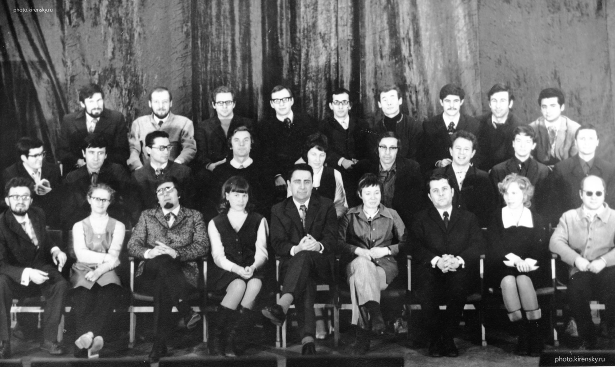 Сотрудники теоретического отдела Института физики им. Л.В. Киренского Сибирского отделения академии наук СССР, Сидят, слева направо: Хлебопрос Р.Г., Михайловская Л.В., Кузьмин Е.В., Игнатова Л., Игнатченко В.А., заведующий отделом, Филоненко Н., Захаров Ю.В., Сандалова Т.П., Куденко Ю.А. В среднем ряду:Борисюк В.А, Дегтярёв Г.В., Баранцов В.И., Попов А.К., Попова Т.Я., Заславский Г.М., Шапиро В.Ш., Маньков Ю.И., Сливинский А.П. В верхнем раду: Сандалов И.С., Тартаковский Г.Х., Дисковский В.А., Белобров П.И., Ореховский З.Б., Пономорёв В.И., Цифринович В.И., Гехт В.С., Берман Г.П. 1973 год.