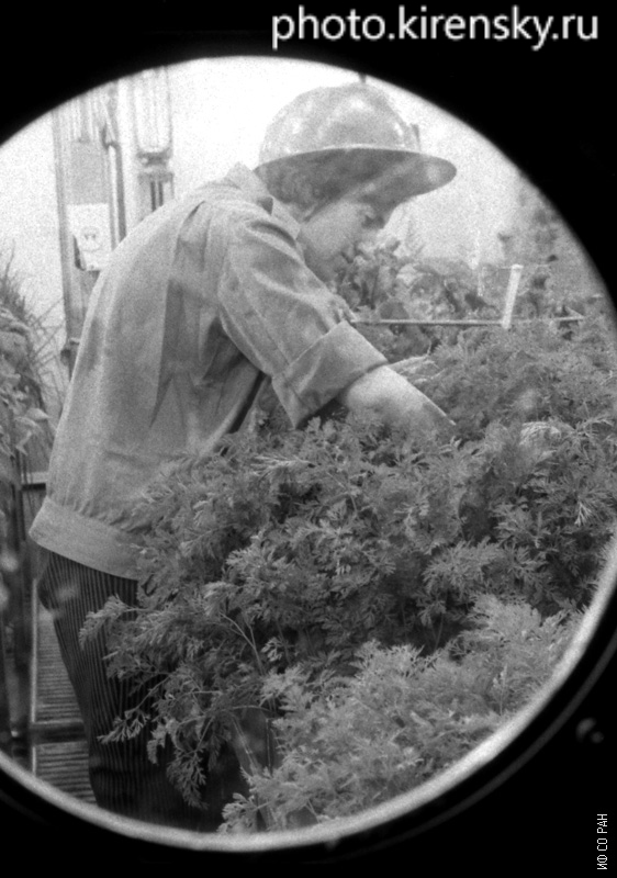 На фото запечатлена часть отсека со специальным набором овощных и зерновыми культур, обеспечивающих газо- и водообмен, в установке «БИОС-3» за счет интенсивного биосинтеза. Видно, что культуры высеваются не одновременно, но с разбегом по времени. Шиленко М.П. за работой на «огороде» - собирает урожай во время шестимесячного эксперимента в экспериментальной автономной экосистеме "Биос-3". Эксперимент проведен отделом биофизики Института физики им. Л.В. Киренского Сибирского отделения Академии наук СССР (ИФ СО АН СССР) в 1973 году. Фрагмент на видео https://youtu.be/X6XqUOP0nSs?t=181
