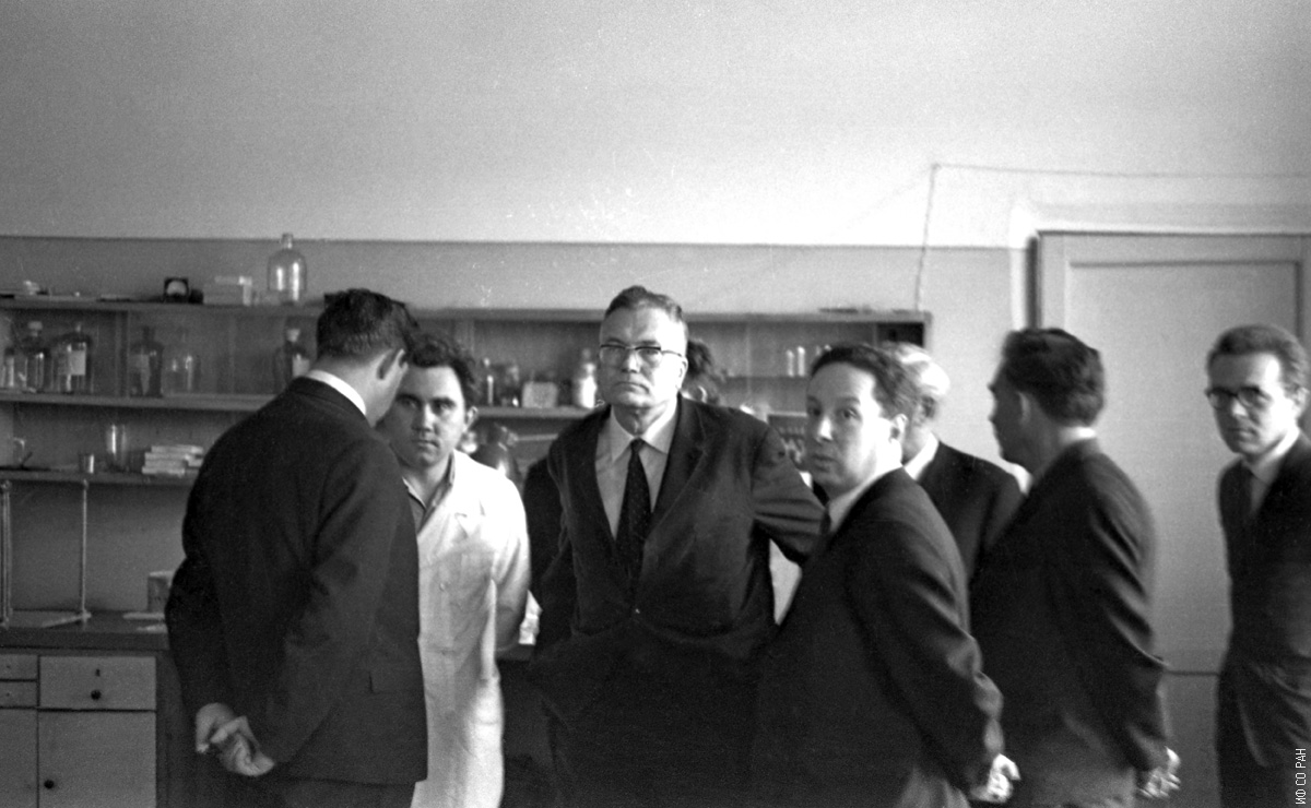 В 1964 год. Институт физики Сибирского отделения Академии наук СССР (ИФ СО АН СССР) посетил директор Института неорганической химии СО АН СССР член-корр. Академии наук А.В. Николаев, директор Института физики твердого тела и полупроводников, член-корр. Академии наук Ржанов А.В. и директор Норильского горно-металлургического комбината Долгих В.И. Снимок сделан в отделе биофизики. Слева направо: Долгих В.И. , Ржанов А.В., Терсков И.А., заместитель директора по научной работе института, Киренский Л.В., директор института, Александров К.С., заместитель директора по научной работе, Гительзон И.И., заведующий лабораторией фотобиологии. Красноярск.