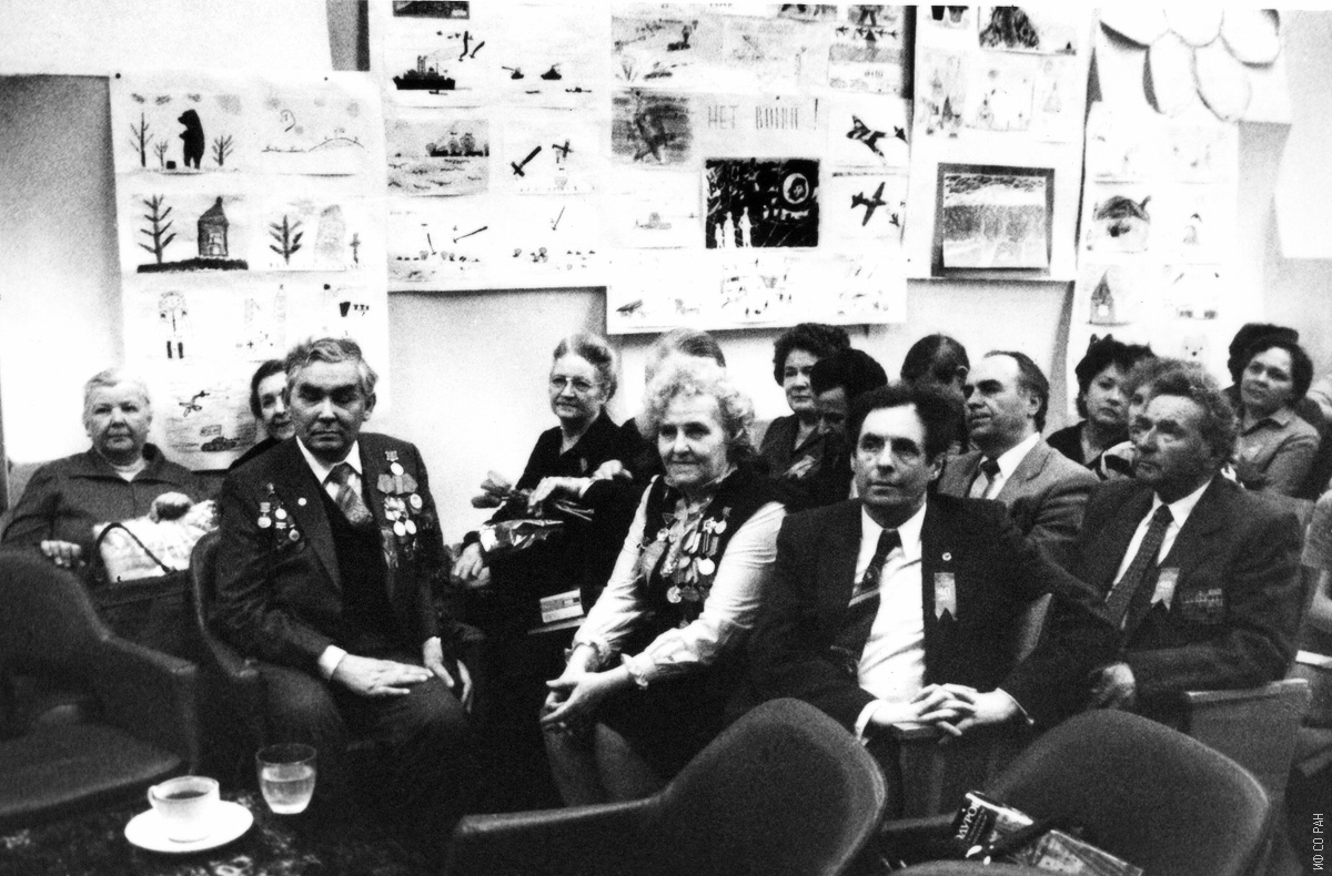 Чествование ветеранов Великой Отечественной войны в Институте физики им. Л.В. Киренского Сибирского отделения Академии наук СССР (ИФ СО АН СССР) в День победы 9 мая. В первом ряду (с орденами и медалями) директор института И.А.Терсков, его супруга Надежда Кирилловна Терскова, рядом с ней И.И. Гительзон, во втором ряду второй справа - Г.М. Лисовский, 1980 год. Красноярск.