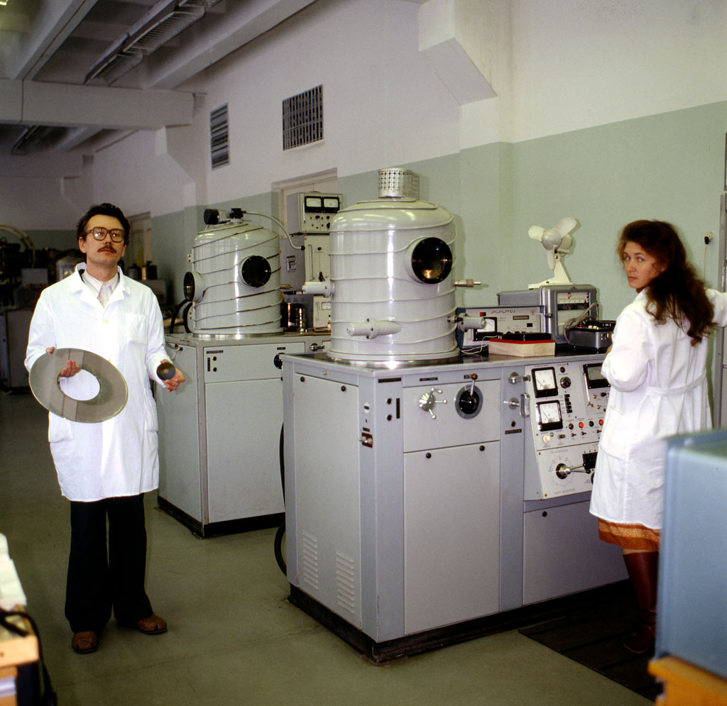 1985 год. В лаборатории физики магнитных пленок Института физики им. Л.В. Киренского Сибирского отделения Академии наук СССР проводились работы по синтезу магнитопленочных материалов, изучению их физических свойств и созданию на их основе устройств радиоэлектроники. В лаборатории был получен целый ряд новых материалов, обладающих уникальными свойствами, на базе которых были разработаны устройства для различных областей техники. На снимке: Алексей Евгеньевич Худяков и Нина Ивановна Верхотурова в зале вакуумных установок УВН-2м для напыления тонких магнитных пленок. Красноярск.