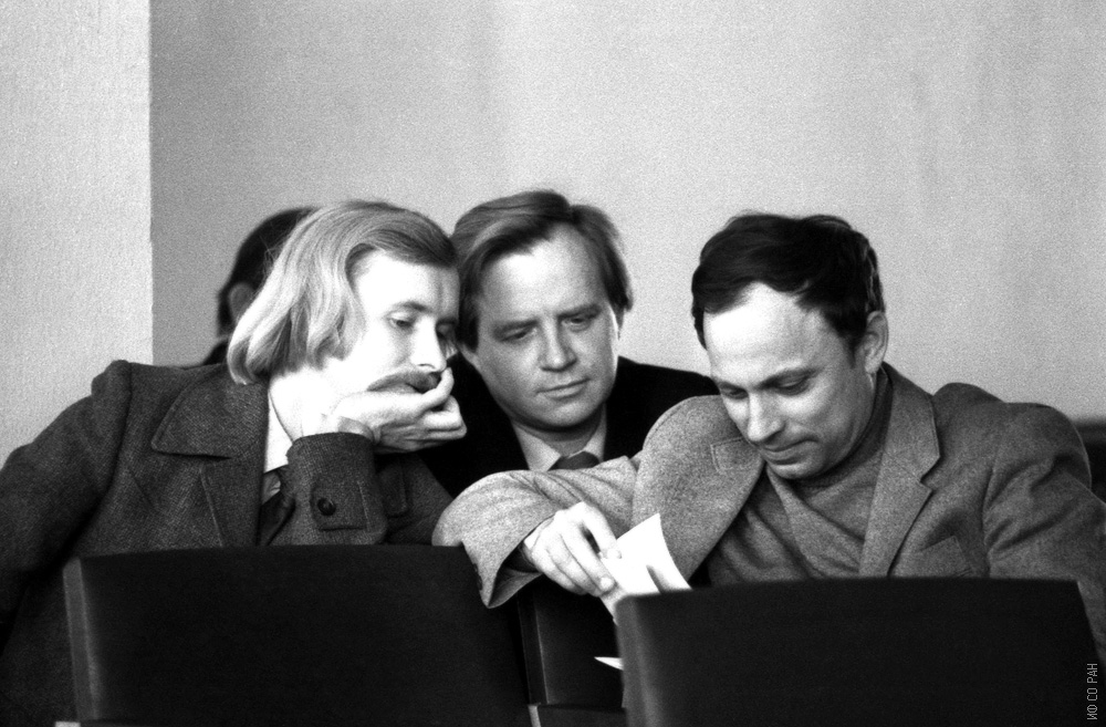 Слева направо: Втюрин Александр Николаевич, Шкуряев Петр Георгиевич , Москвич Юрий Николаевич, в конференц-зале Института физики им. Л.В. Киренского Сибирского отделения Академии наук СССР (ИФ СО АН СССР), фото 1978 года. Красноярск.