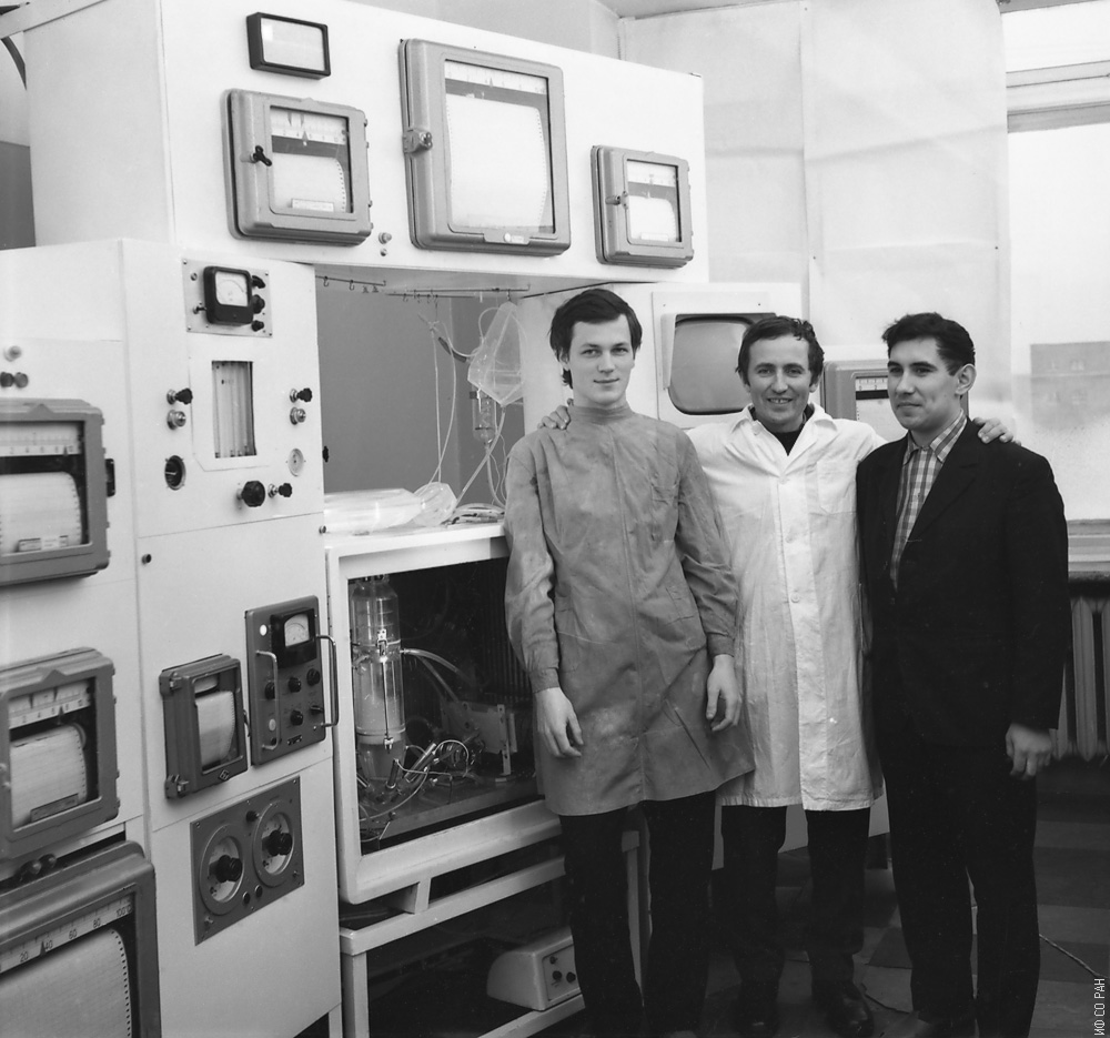 В лаборатории радиофотобиологии Института физики им. Л.В. Киренского Сибирского отделения Академии наук СССР (ИФ СО АН СССР), слева направо: Ясников И. Л., Нефедов В. П., Дубынин В. Н., у установки «Гомеостат», для управляемого культивирования изолированных органов млекопитающих, фото 1974 года. Красноярск.